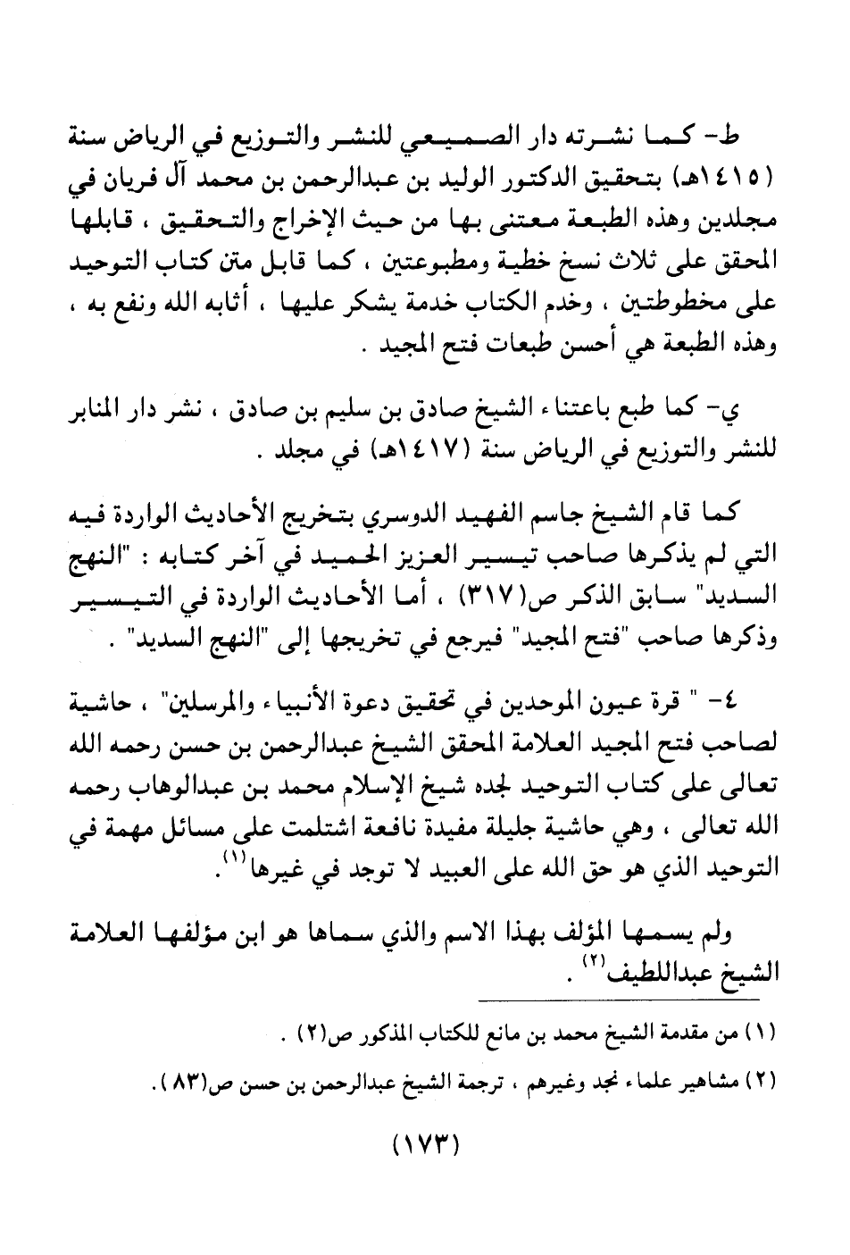 ط ـ كما نشرته دار الصميعي للنشر والتوزيع في الرياض سنة (1415هـ) بتحقيق الدكتور الوليد بن عبد الرحمن بن محمد آل فريان في مجلدين وهذه الطبعة معتنى بها من حيث الإخراج والتحقيق، قابلها المحقق على ثلاث نسخ خطية ومطبوعتين، كما قابل متن كتاب التوحيد على مخطوطتين، وخدم الكتاب خدمة يشكر عليها، أثابه الله ونفع به، وهذه الطبعة هي أحسن طبعات فتح المجيد.
