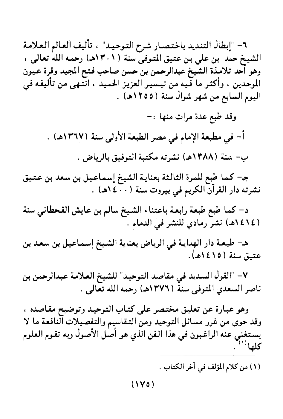 6 ـ " إبطال التنديد باختصار شرح التوحيد " تأليف العالم العلامة الشيخ حمد بن علي بن عتيق المتوفي سنة (1301هـ) رحمه الله تعالى، وهو أحد تلامذة الشيخ عبد الرحمن بن حسن صاحب فتح المجيد وقرة عيون الموحدين، وأكثر مافيه من تيسير العزيز الحميد، انتهى من تأليفه في اليوم السابع من شهر شوال سنة (1255هـ) .