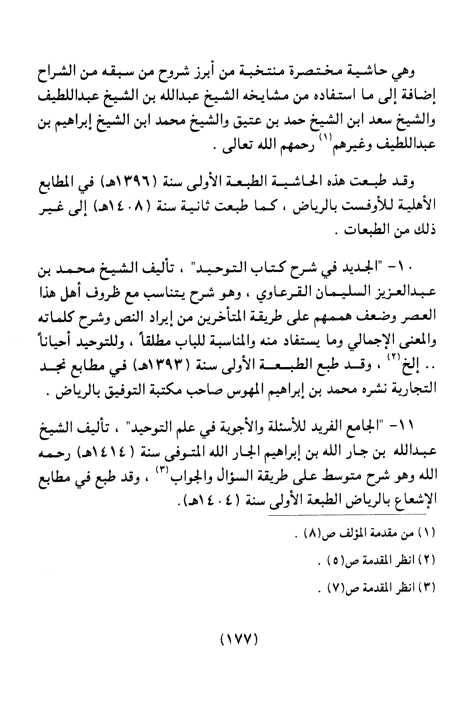 11 ـ " الجامع الفريد للأسئلة والأجوبة في علم التوحيد " تأليف الشيخ عبد الله بن جار الله بن إبراهيم الجار الله المتوفي سنة (1414هـ) رحمه الله وهو شرح متوسط على طريقة السؤال والجواب (¬3) ، وقد طبع في مطابع الإشعاع بالرياض الطبعة الأولى سنة (1404هـ) .