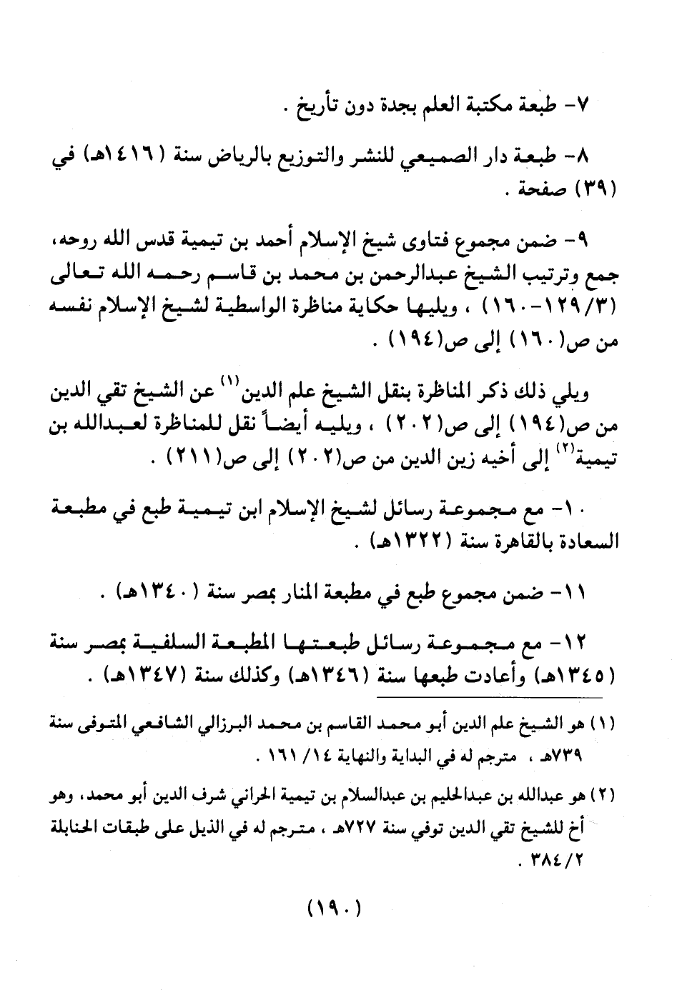 11 ـ ضمن مجموعة رسائل طبعتها المطبعة السلفية بمصر سنة (1345هـ) وأعادت طبعها سنة (1346هـ) وكذلك سنة (1347هـ) .