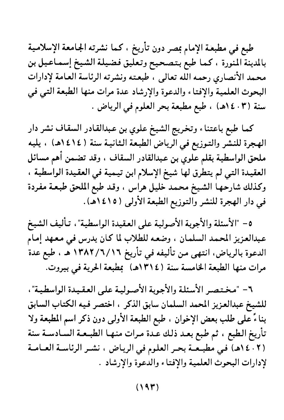 6 ـ " مختصر الأسئلة والأجوبة الأصولية على العقيدة الواسطية " للشيخ عبد العزيز المحمد السلمان، سابق الذكر، اختصر فيه الكتاب السابق بناءً على طلب بعض الإخوان، طبع الطبعة الأولى دون ذكر اسم المطبعة ولا تاريخ الطبع، ثم طبع بعد ذلك عدة مرات منها الطبعة السادسة سنة (1402هـ) في مطبعة بحر العلوم في الرياض، نشر الرئاسة العامة لإدارات البحوث العلمية والإفتاء والدعوة والإرشاد.
