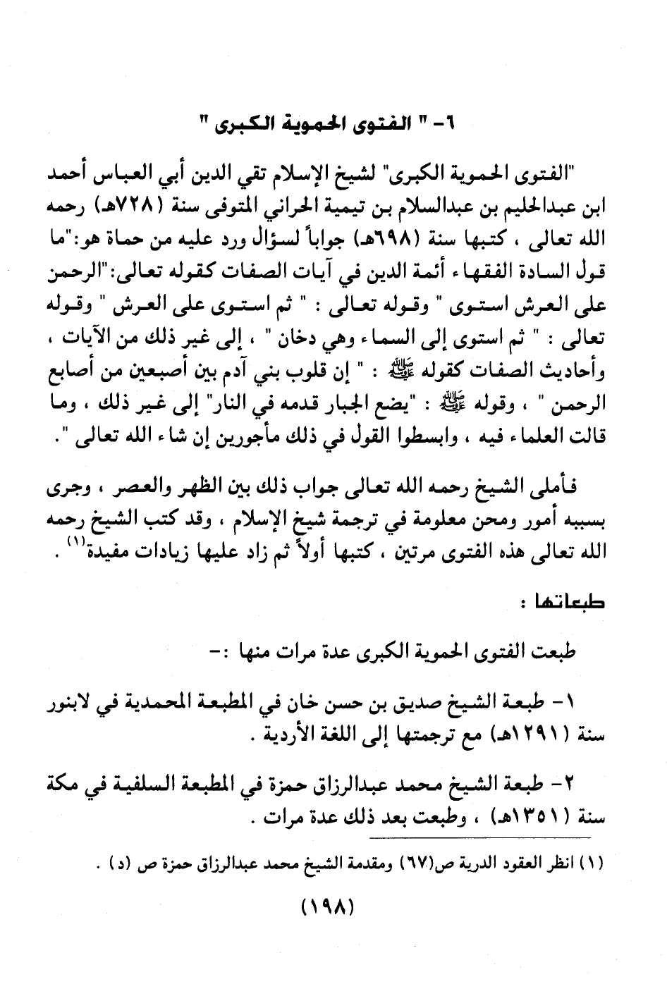 " الفتوى الحموية الكبرى " لشيخ الإسلام تقي الدين أبي العباس أحمد ابن عبد الحليم بن عبد السلام بن تيمية الحراني المتوفي سنة (728هـ) رحمه الله تعالى، كتبها سنة (698هـ) جواباً لسؤال ورد عليه من حماة هو: " ماقول السادة الفقهاء أئمة الدين في آيات الصفات كقوله تعالى: " الرحمن على العرش استوى " وقوله ثم استوى على العرش " وقوله تعالى: {ثم استوى إلى السماء وهي دخان} إلى غير ذلك من الآيات، وأحاديث الصفات كقوله صلى الله عليه وسلم " إن قلوب بني آدم بين أصبعين من أصابع الرحمن " وقوله صلى الله عليه وسلم " يضع الجبار قدمه في النار " إلى غير ذلك، وماقالت العلماء فيه، وابسطوا القول في ذلك مأجورين إن شاء الله تعالى ".
