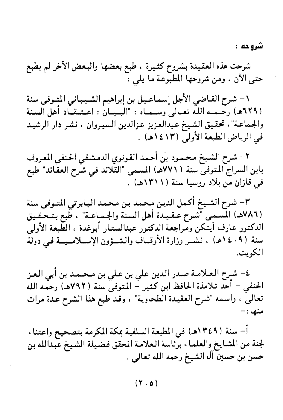1 ـ شرح القاضي الأجل إسماعيل بن إبراهيم الشيباني المتوفي سنة (629هـ) رحمه الله تعالى وسماه: " البيان: اعتقاد أهل السنة والجماعة " تحقيق الشيخ عبد العزيز عز الدين السيروان، نشر دار الرشيد في الرياض الطبعة الأولى (1413هـ) .