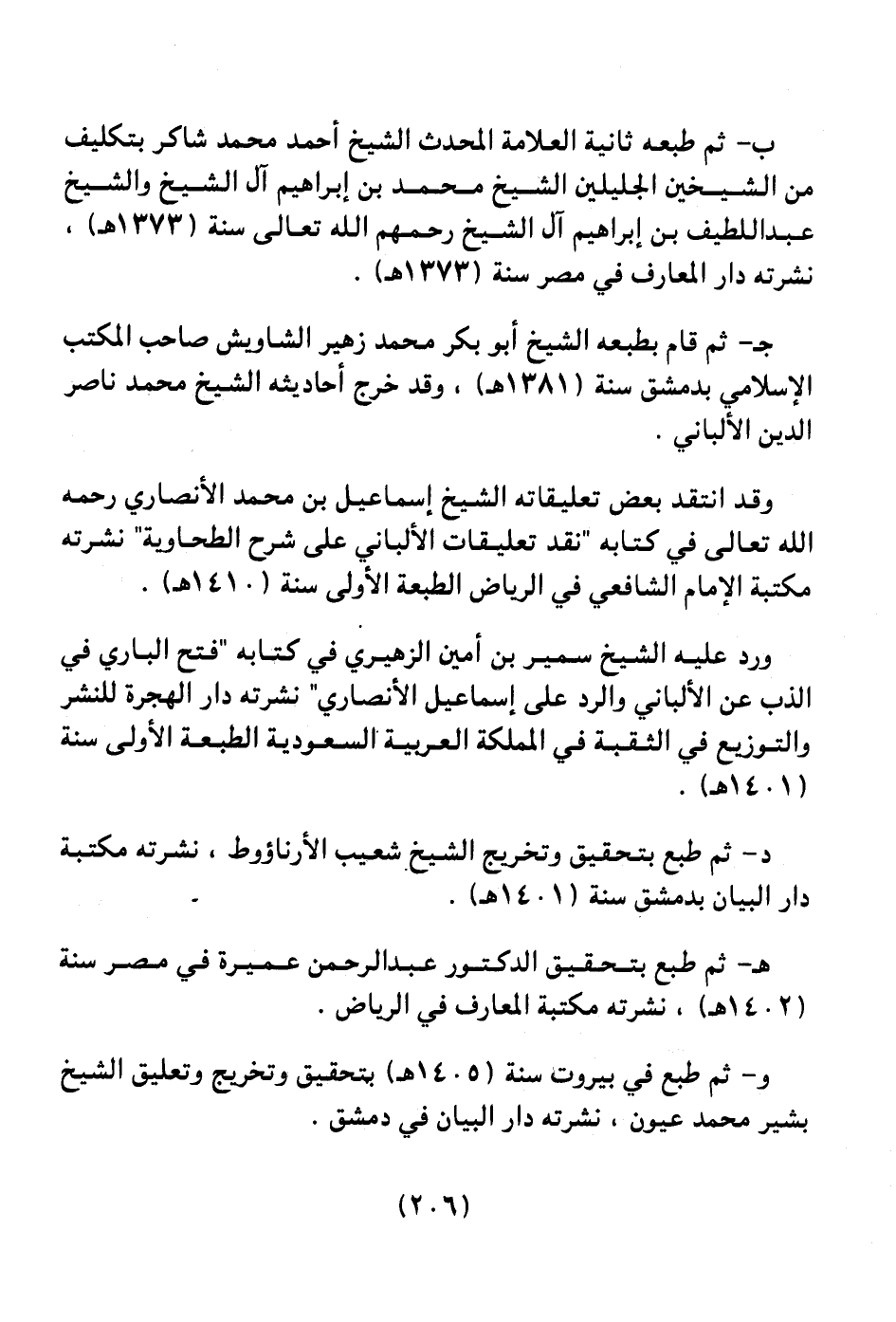 جـ ـ ثم قام بطبعه الشيخ أبو بكر محمد زهير الشاويش صاحب المكتب الإسلامي بدمشق سنة (1381هـ) ، وقد خرج أحاديثه الشيخ محمد ناصر الدين الألباني.