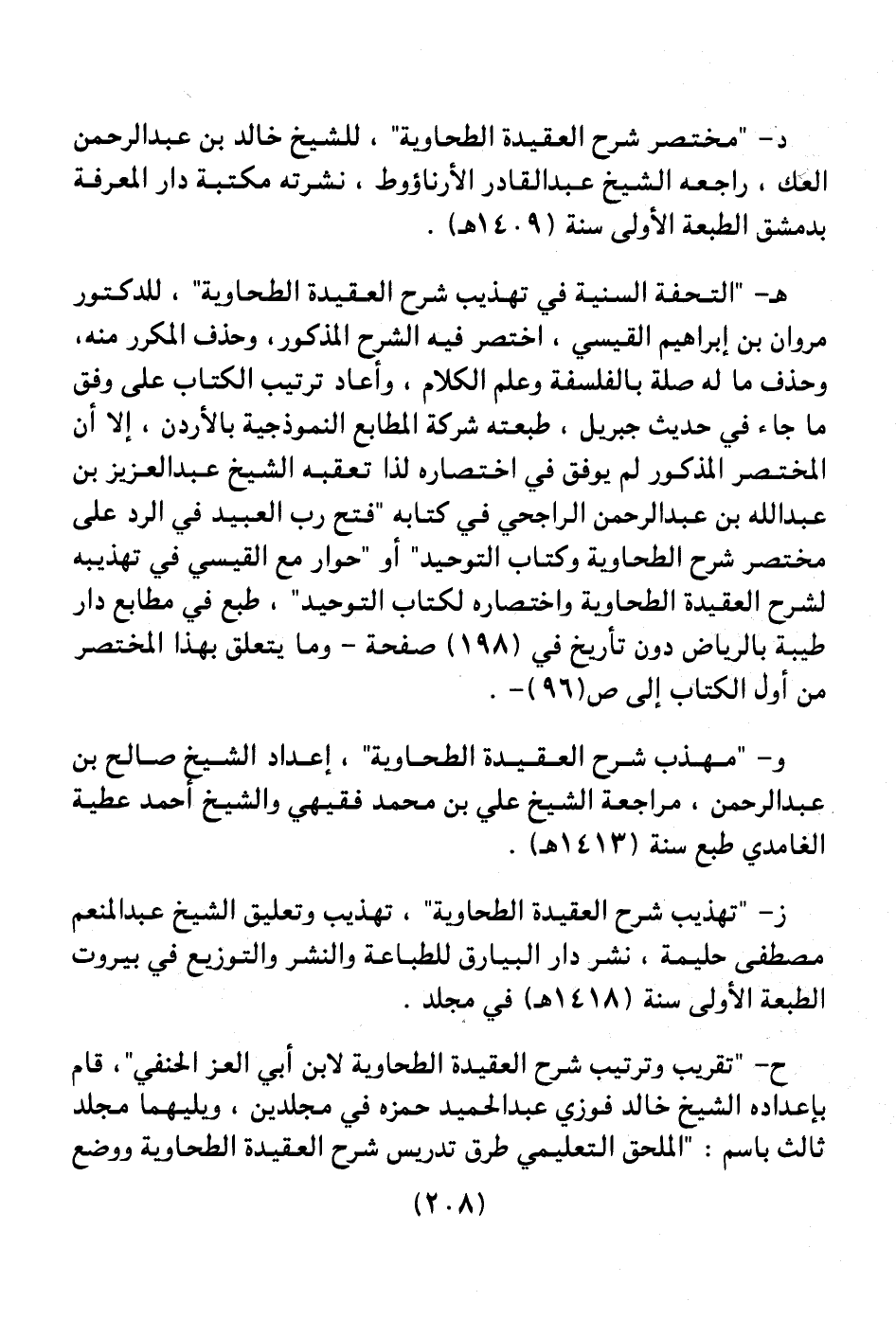 ز ـ " تهذيب شرح العقيدة الطحاوية " تهذيب وتعليق الشيخ عبد المنعم مصطفى حليمة، نشر دار البيارق للطباعة والنشر والتوزيع في بيروت الطبعة الأولى سنة (1418هـ) في مجلد.
