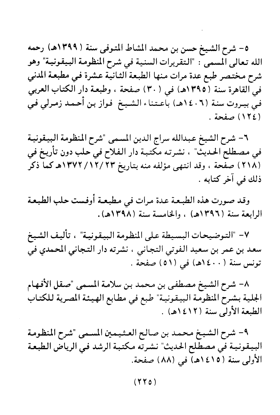 9 ـ شرح الشيخ محمد بن صالح بن صالح العثيمين المسمى " شرح المنظومة البيقونية في مصطلح الحديث " نشرته مكتبة الرشد في الرياض الطبعة الأولى سنة (1415هـ) في (88) صفحة.