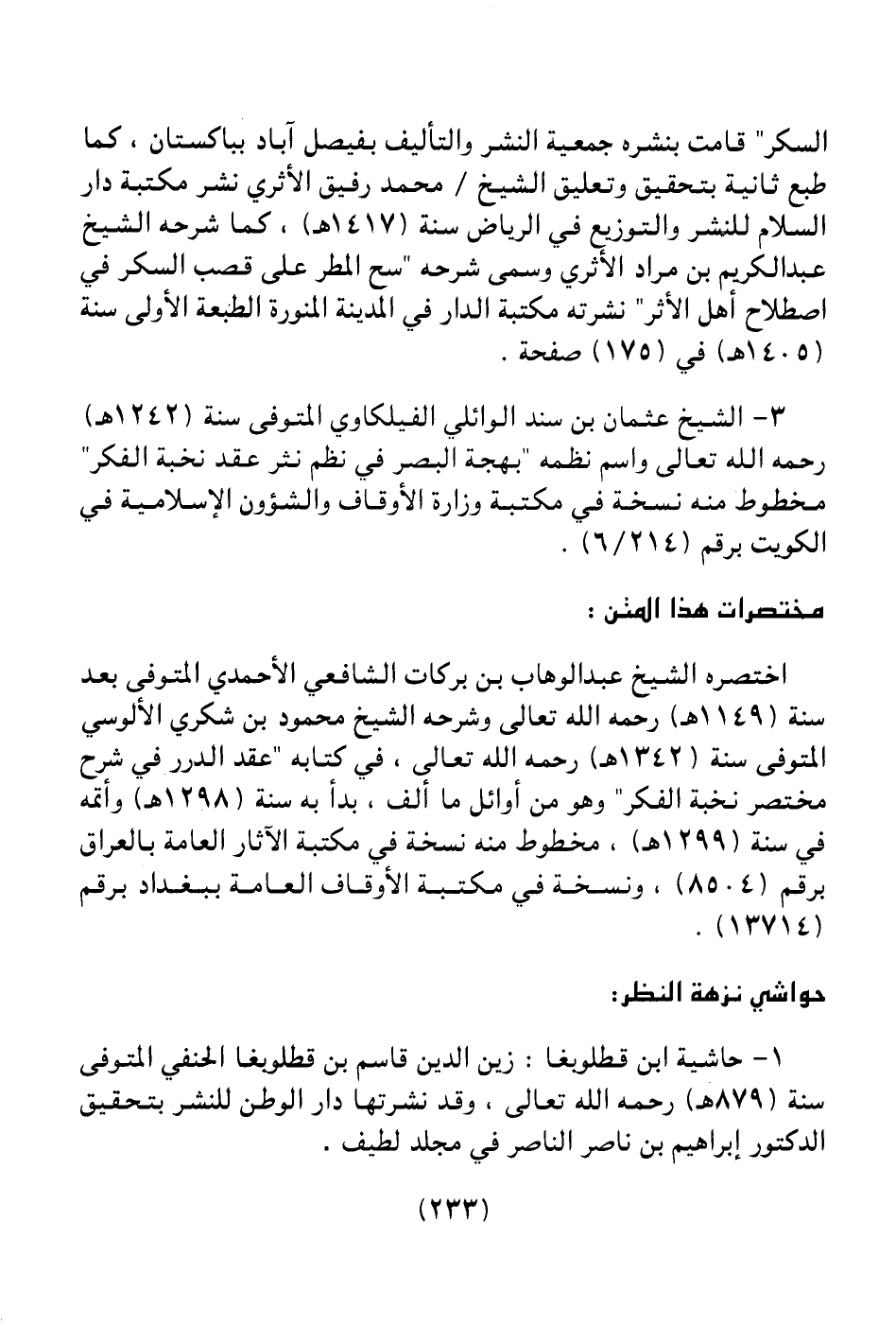 3 ـ الشيخ عثمان بن سند الوائلي الفيلكاوي المتوفي سنة (1242هـ) رحمه الله تعالى واسم نظمه " بهجة البصر في نظم نثر عقد نخبة الفكر" مخطوط منه نسخة في مكتبة وزارة الأوقاف والشؤون الإسلامية في الكويت برقم (214/6) .