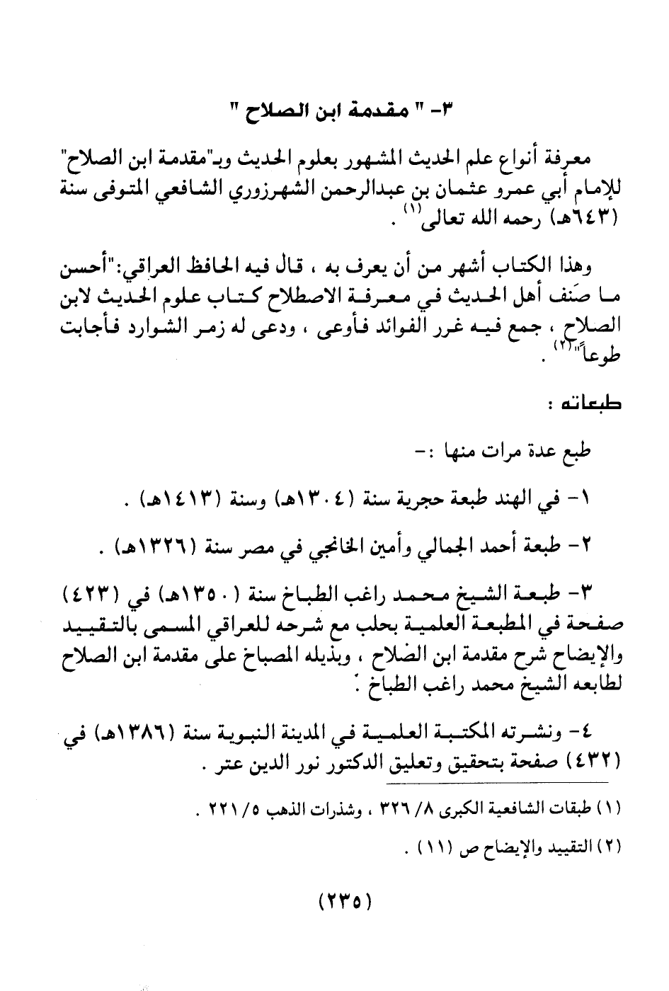 3 ـ طبعة الشيخ محمد راغب الطباخ سنة (1350هـ) في (423) صفحة في المطبعة العلمية بحلب مع شرحه للعراقي المسمى بالتقييد والإيضاح شرح مقدمة ابن الصلاح، وبذيله المصباخ على مقدمة ابن الصلاح لطابعه الشيخ محمد راغب الطباخ.