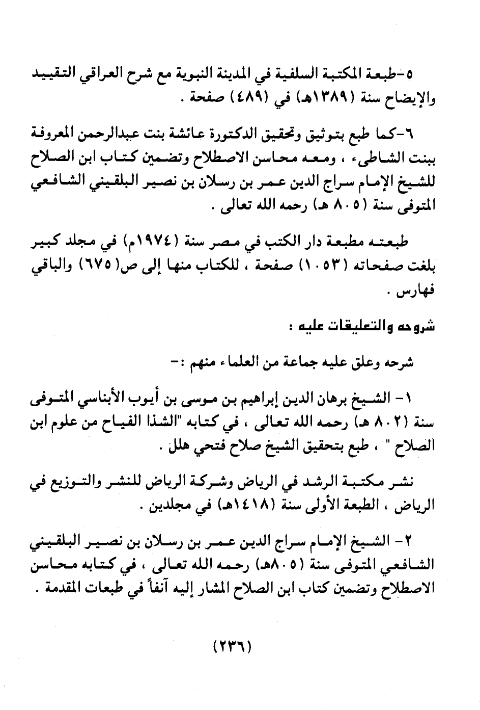 2 ـ الشيخ الإمام سراج الدين عمر بن رسلان بن نصير البلقيني الشافعي المتوفي سنة (805هـ) رحمه الله تعالى، في كتابه محاسن الاصطلاح وتضمين كتاب ابن الصلاح المشار إليه آنفاً في طبعات المقدمة.