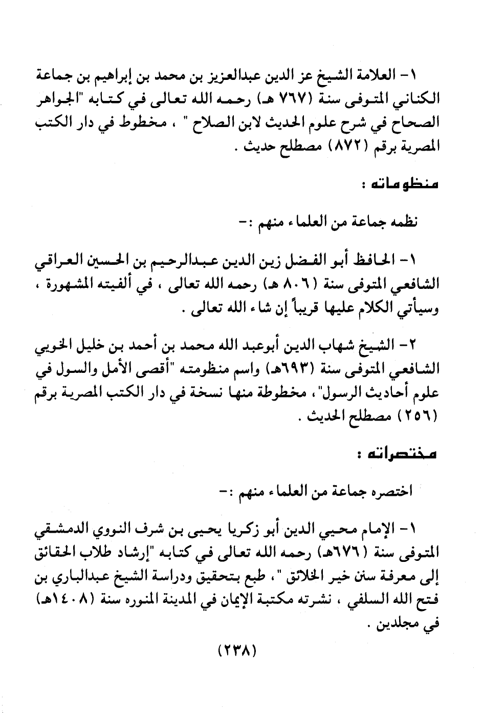 1 ـ العلامة الشيخ عز الدين عبد العزيز بن محمد بن إبراهيم بن جماعة الكناني المتوفي سنة (767هـ) رحمه الله تعالى في كتابه" الجواهر الصحاح في شرح علوم الحديث لابن الصلاح "، مخطوط في دار الكتب المصرية بقرم (872) مصطلح حديث.