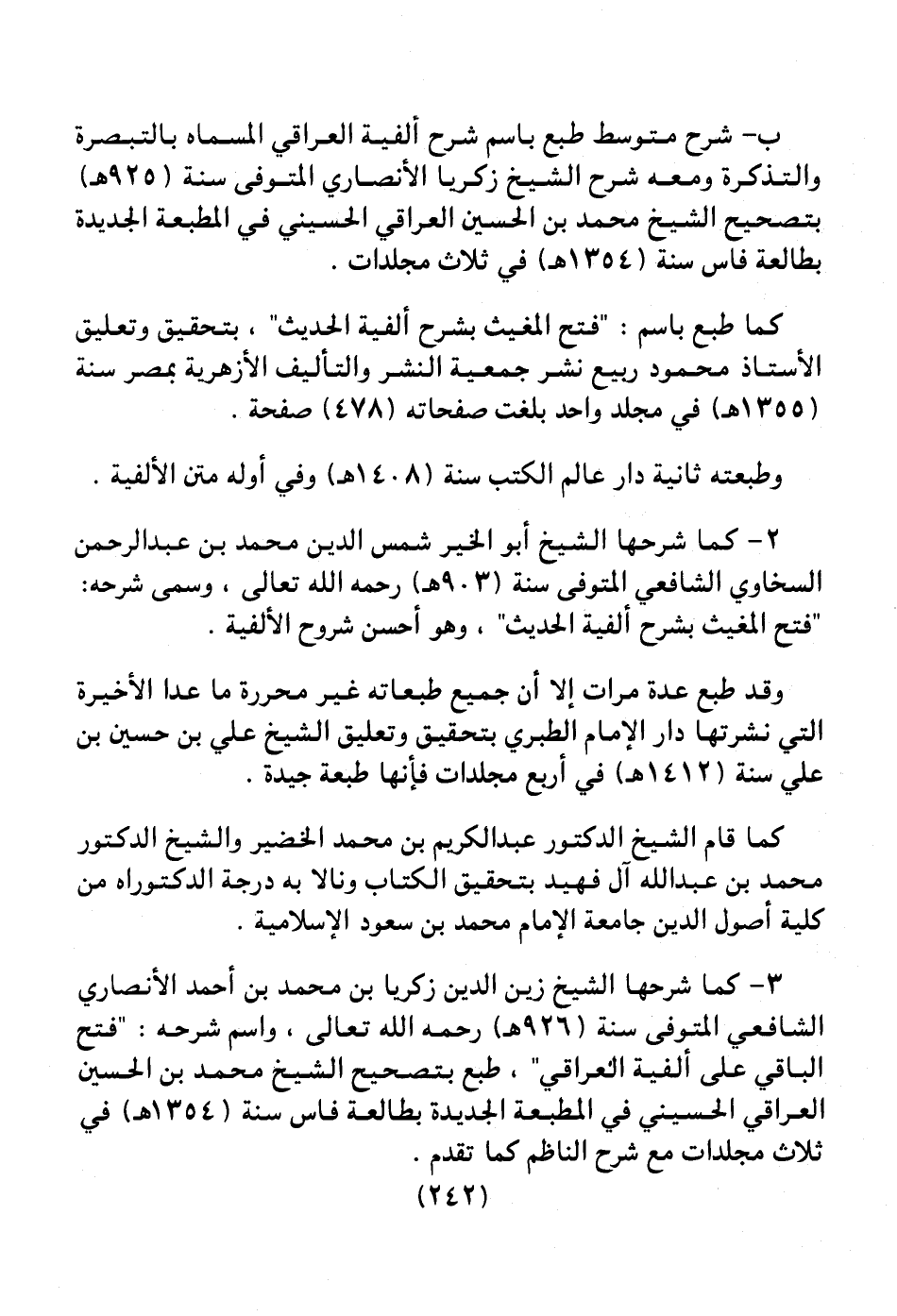 ب ـ شرح متوسط طبع باسم شرح ألفية العراقي المسماه بالتبصرة والتذكرة ومعه شرح الشيخ زكريا الأنصاري المتوفي سنة (925هـ) بتصحيح الشيخ محمد بن الحسين العراقي الحسيني في المطبعة الجديدة بطالعة فاس سنة (1354هـ) في ثلاث مجلدات.