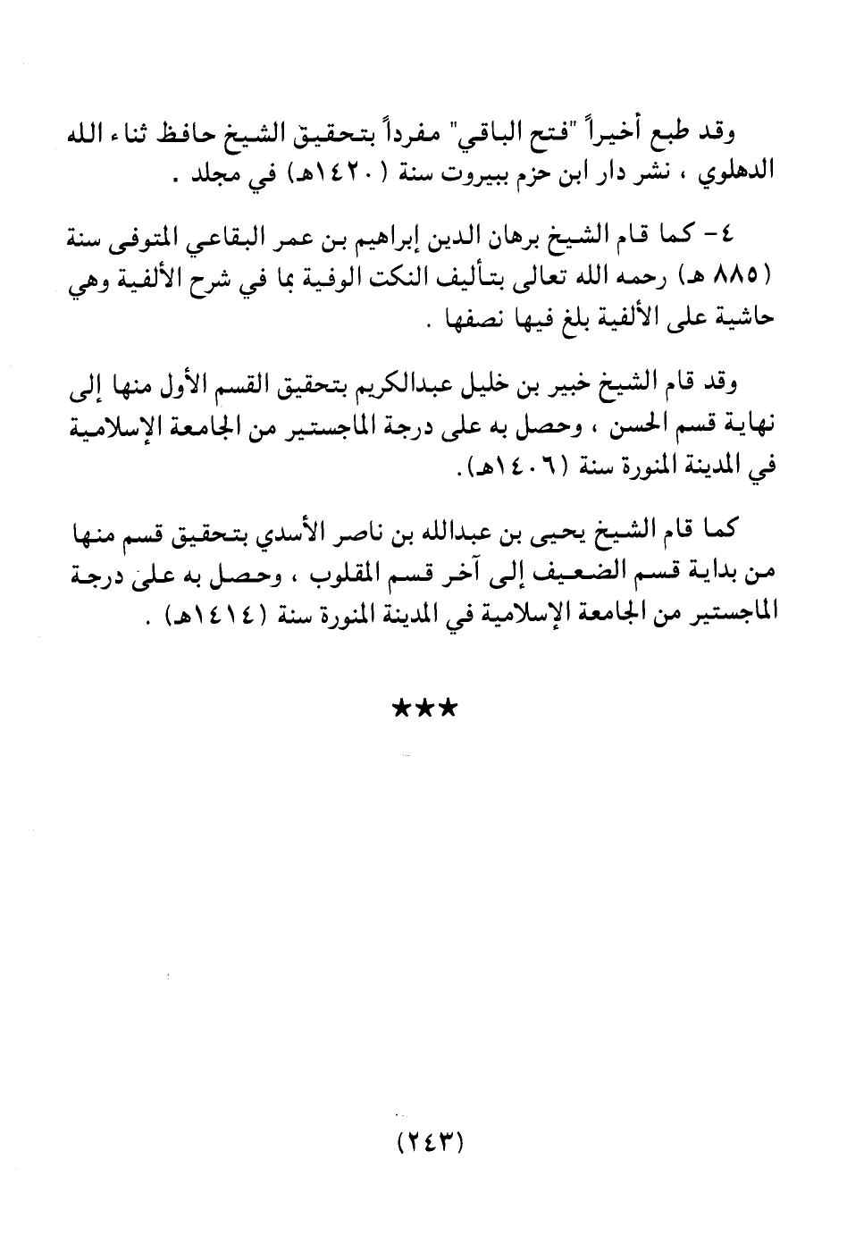 وقد طبع أخيراً " فتح الباقي " مفرداً بتحقيق الشيخ حافظ ثناء الله الدهلوي، نشر دار ابن حزم ببيروت سنة (1420هـ) في مجلد.