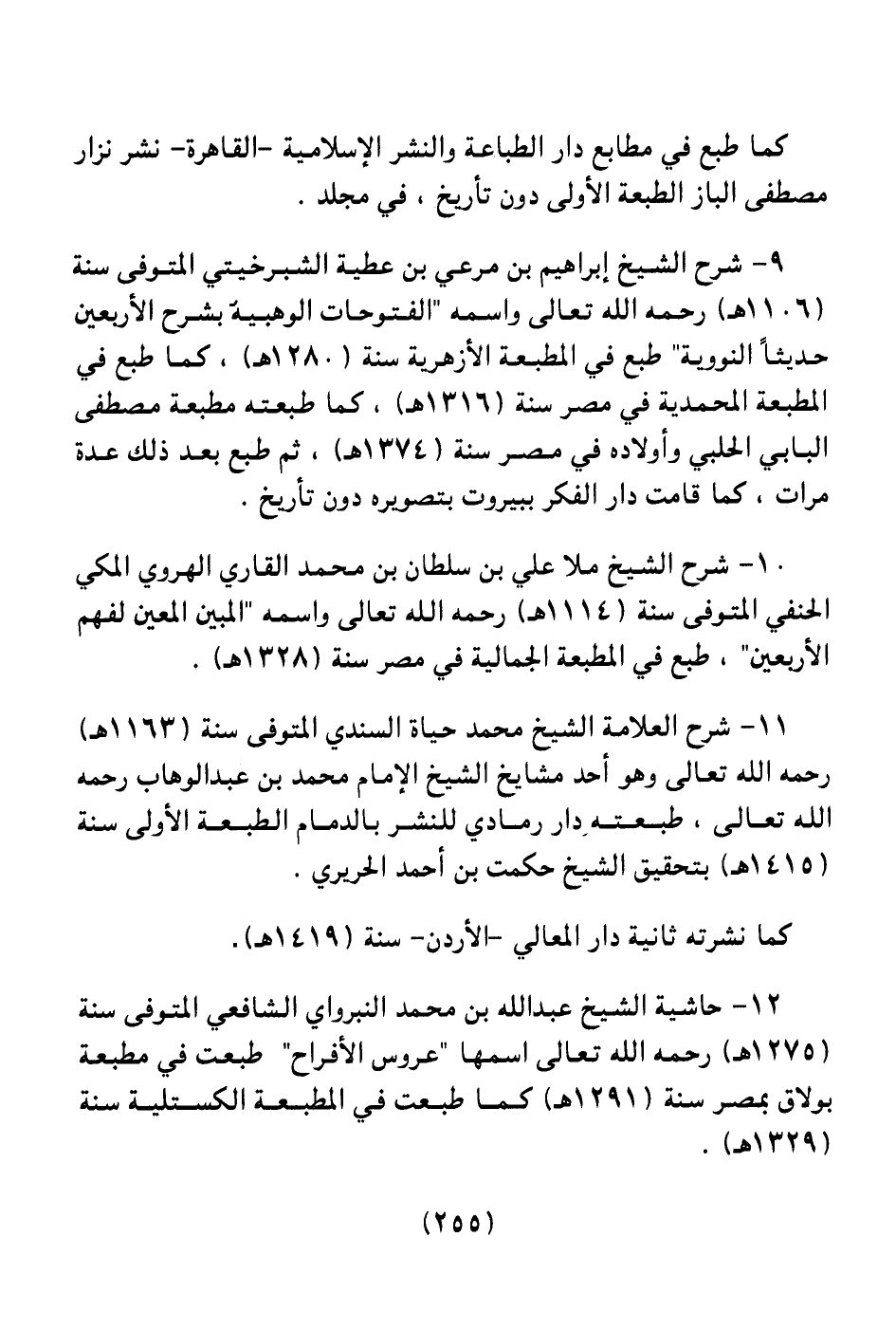 9 ـ شرح الشيخ إبراهيم بن مرعي بن عطية الشبرخيتي المتوفي سنة (1106هـ) رحمه الله تعالى واسمه " الفتوحات الوهبية بشرح الأربعين حديثاً النووية " طبع في المطبعة الأزهرية سنة (1280هـ) كما طبع في المطبعة المحمدية في مصر سنة (1316هـ) ، ثم طبع بعد ذلك عدة مرات، كما قامت دار الفكر ببيروت بتصويره دون تاريخ.
