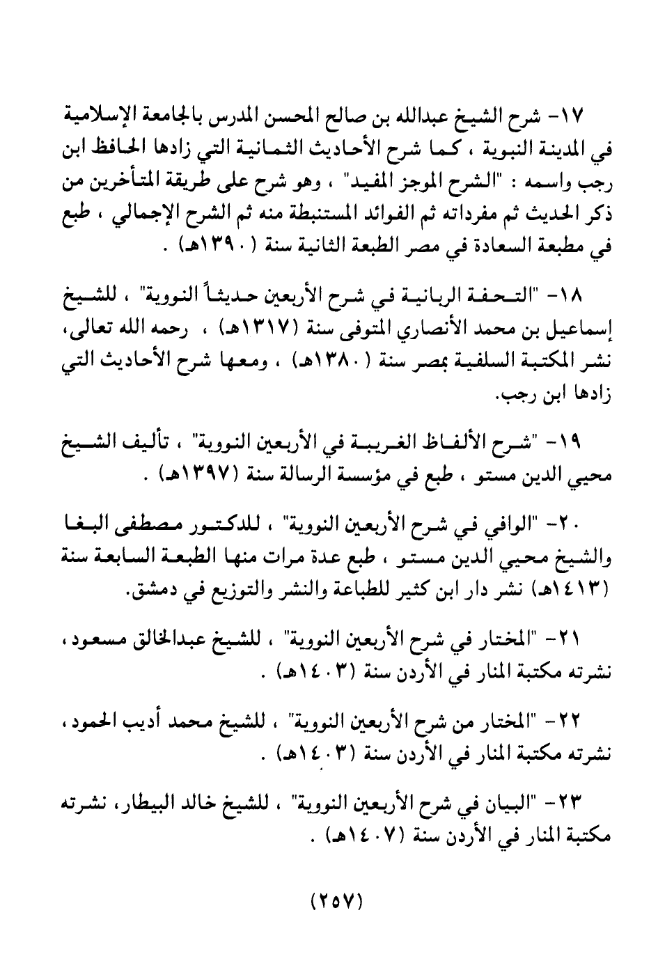 18 ـ " التحفة الربانية في شرح الأربعين حديثاً النووية " للشيخ إسماعيل بن محمد الأنصاري المتوفي سنة (1317هـ) ، رحمه الله تعالى، نشر المكتبة السلفية بمصر سنة (1380هـ) ، ومعها شرح الأحاديث التي زادها ابن رجب.