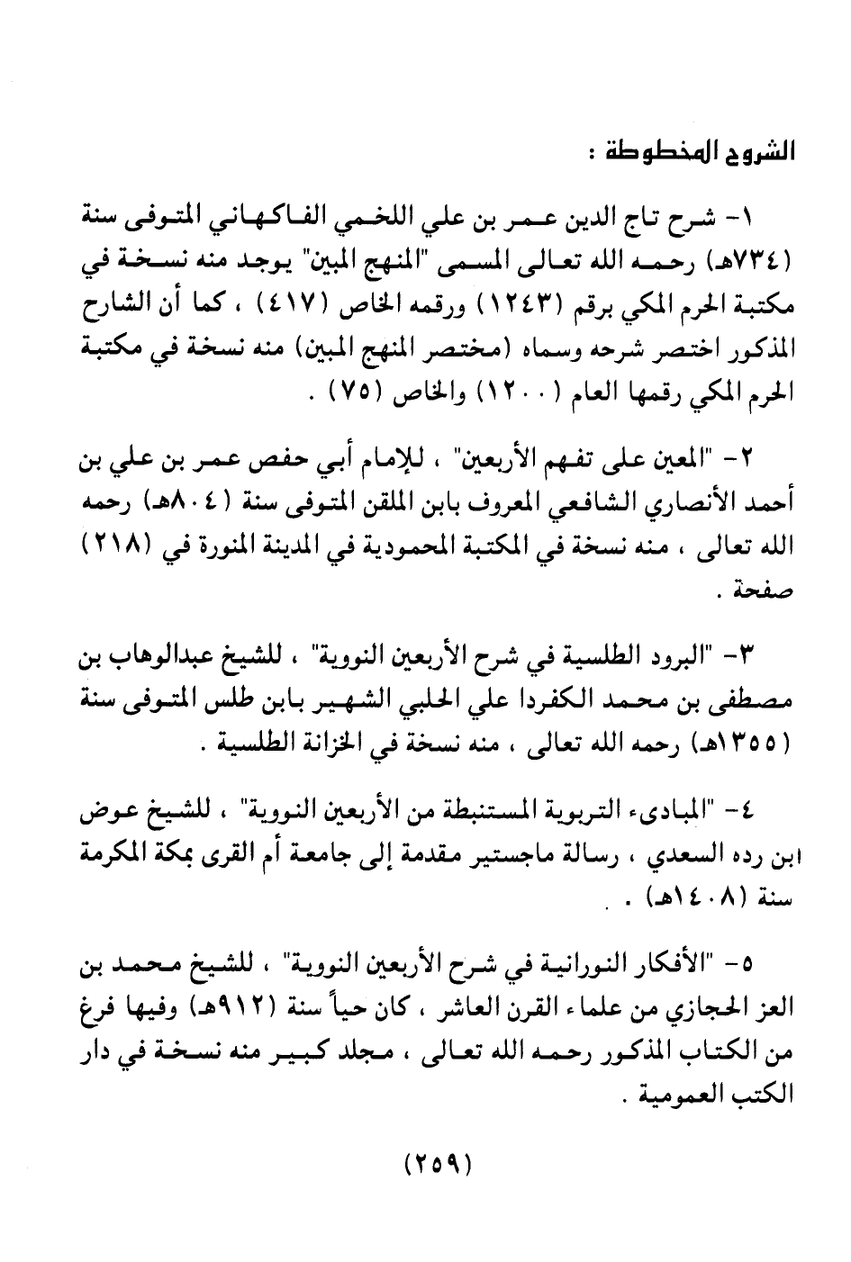 2 ـ " المعين على تفهم الأربعين " للإمام أبي حفص عمر بن علي بن أحمد الأنصاري الشافعي المعروف بابن الملقن المتوفي سنة (804هـ) رحمه الله تعالى، منه نسخة في المكتبة المحمودية في المدينة المنورة في (218) صفحة.