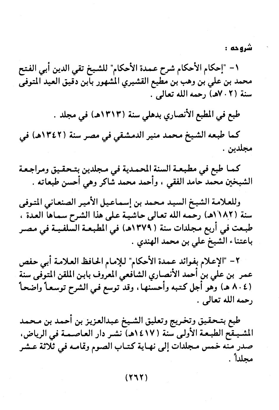 1 ـ " إحكام الأحكام شرح عمدة الأحكام " للشيخ تقي الدين أبي الفتح محمد بن علي بن وهب بن مطيع القشيري المشهور بابن دقيق العيد المتوفي سنة (702هـ) رحمه الله تعالى.