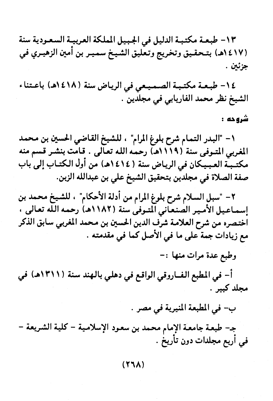1 ـ " البدر التمام شرح بلوغ المرام " للشيخ القاضي الحسين بن محمد المغربي المتوفي سنة (1119هـ) رحمه الله تعالى. قامت بنشر قسم منه مكتبة العبيكان في الرياض سنة (1414هـ) من أول الكتاب إلى باب صفة الصلاة في مجلدين بتحقيق الشيخ علي بن عبد الله الزبن.