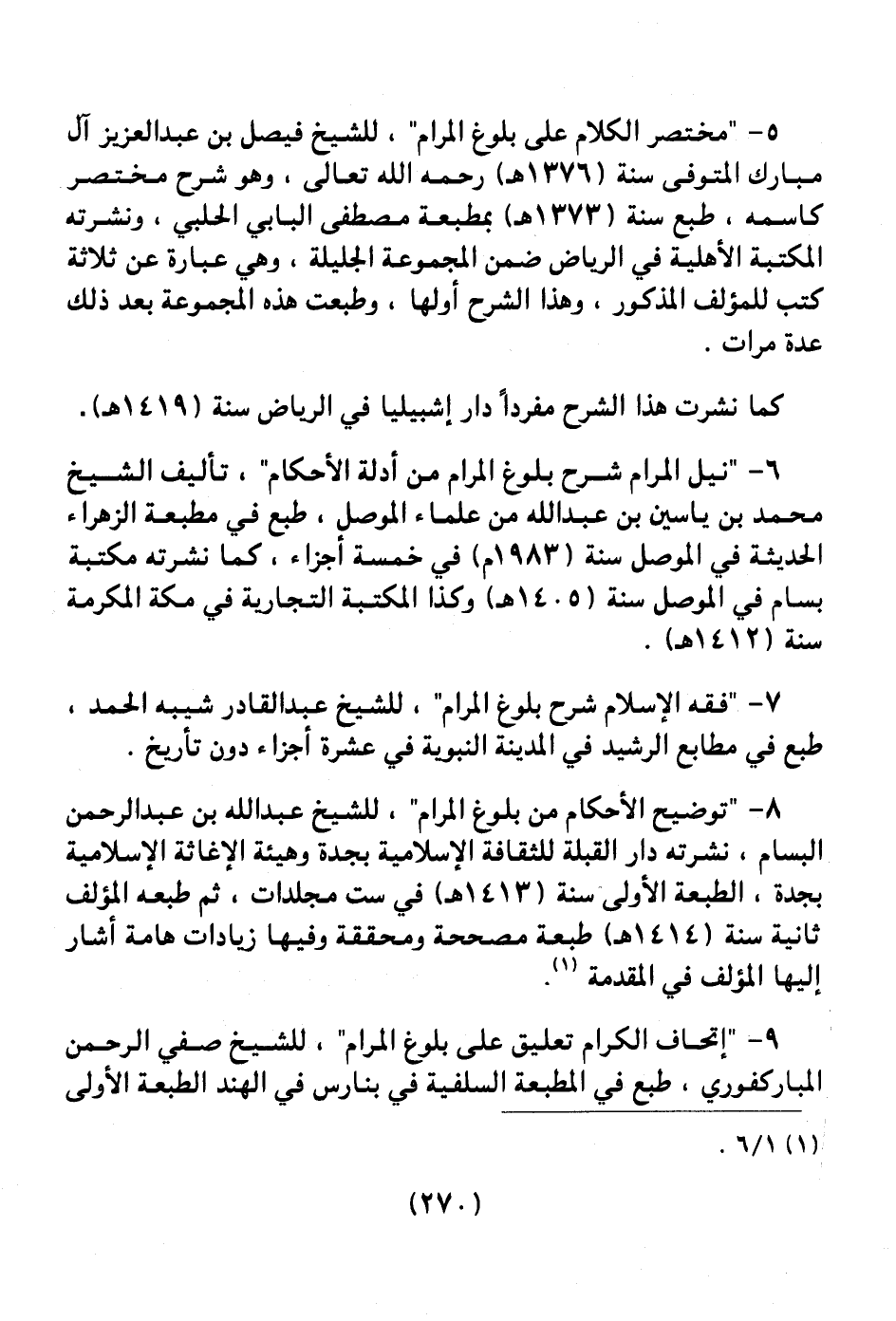 9 ـ " إتحاف الكرام تعليق على بلوغ المرام " للشيخ صفي الرحمن المباركفوري، طبع في المطبعة السلفية في بنارس في الهند الطبعة الأولى