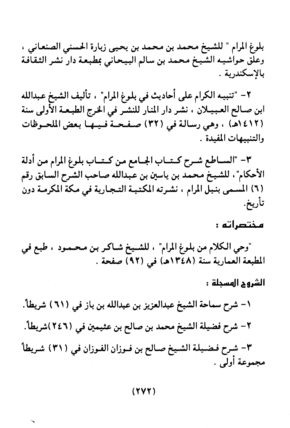 بلوغ المرام " للشيخ محمد بن محمد بن يحيى زبارة الحسني الصنعاني، وعلق حواشيه الشيخ محمد بن سالم البيحاني بمطبعة دار نشر الثقافة بالإسكندرية.