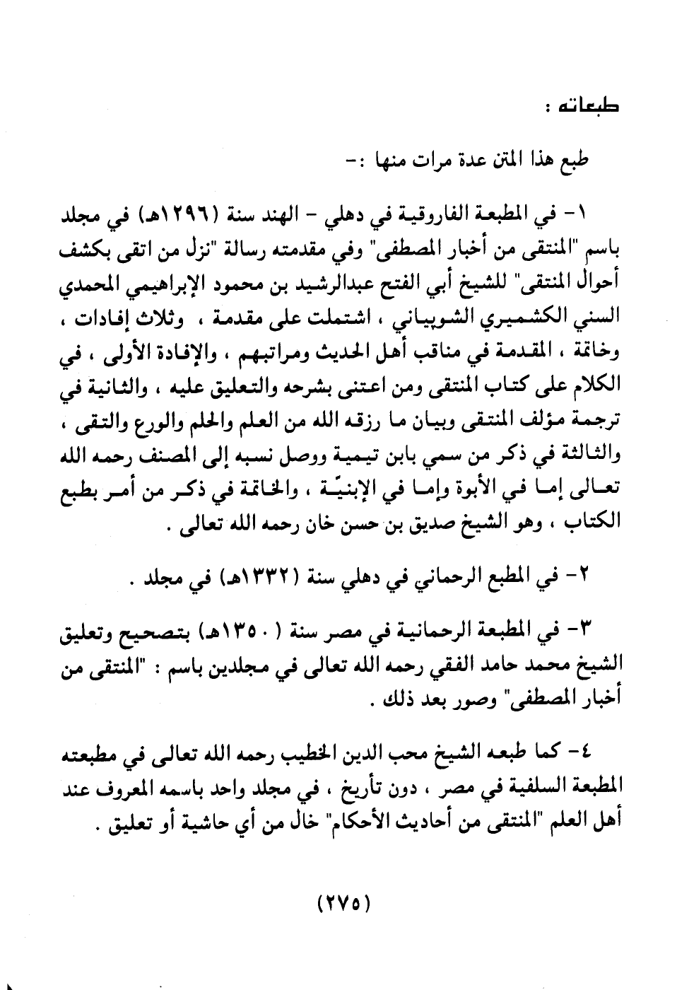 4 ـ كما طبعه الشيخ محب الدين الخطيب رحمه الله تعالى في مطبعته المطبعة السلفية في مصر، دون تاريخ، في مجلد واحد باسمه المعروف عند أهل العلم: المنتقى من أحاديث الأحكام " خال من أي حاشية أو تعليق.