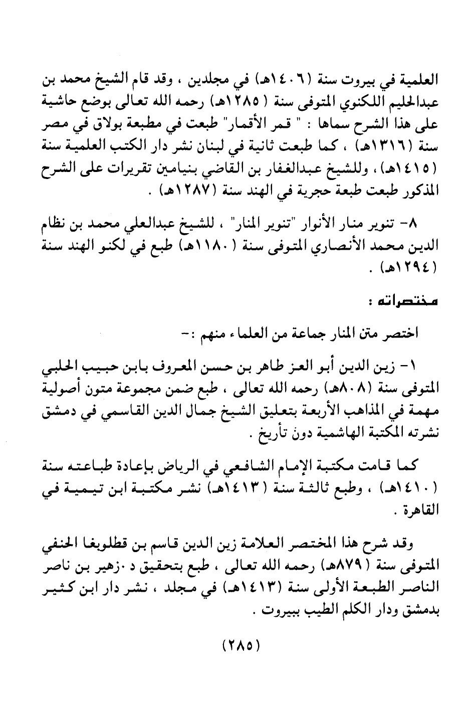 8 ـ تنوير منار الأنوار " تنوير المنار" للشيخ عبد العلي محمد بن نظام الدين محمد الأنصاري المتوفي سنة (1180هـ) طبع في لكنو الهند سنة (1294هـ) .