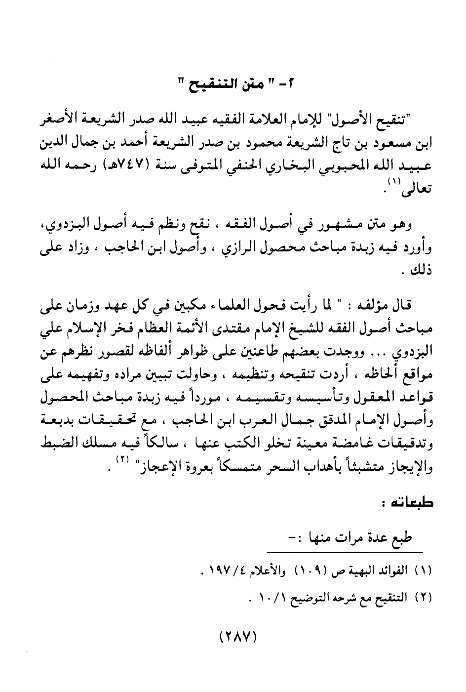 " تنقيح الأصول " للإمام العلامة الفقيه عبيد الله صدر الشريعة الأصغر ابن مسعود بن تاج الشريعة محمود بن صدر الشريعة أحمد بن جمال الدين عبيد الله المحبوبي البخاري الحنفي المتوفي سنة (747هـ) رحمه الله تعالى (¬1) .