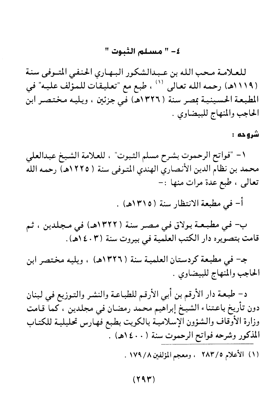 1 ـ " فواتح الرحموت بشرح مسلم الثبوت " للعلامة الشيخ عبد العلي محمد نظام الدين الأنصاري الهندي المتوفي سنة (1225هـ) رحمه الله تعالى، طبع عدة مرات منها: ـ