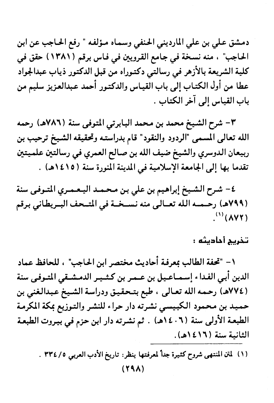 دمشق علي بن علي المارديني الحنفي وسماه مؤلفه " رفع الحاجب عن ابن الحاجب "، منه نسخة في جامع القرويين في فاس برقم (1381) حقق في كلية الشريعة بالأزهر في رسالتي دكتوراه من قبل الدكتور ذياب عبد الجواد عطا من أول الكتاب إلى باب القياس والدكتور أحمد عبد العزيز سليم من باب القياس إلى آخر الكتاب.