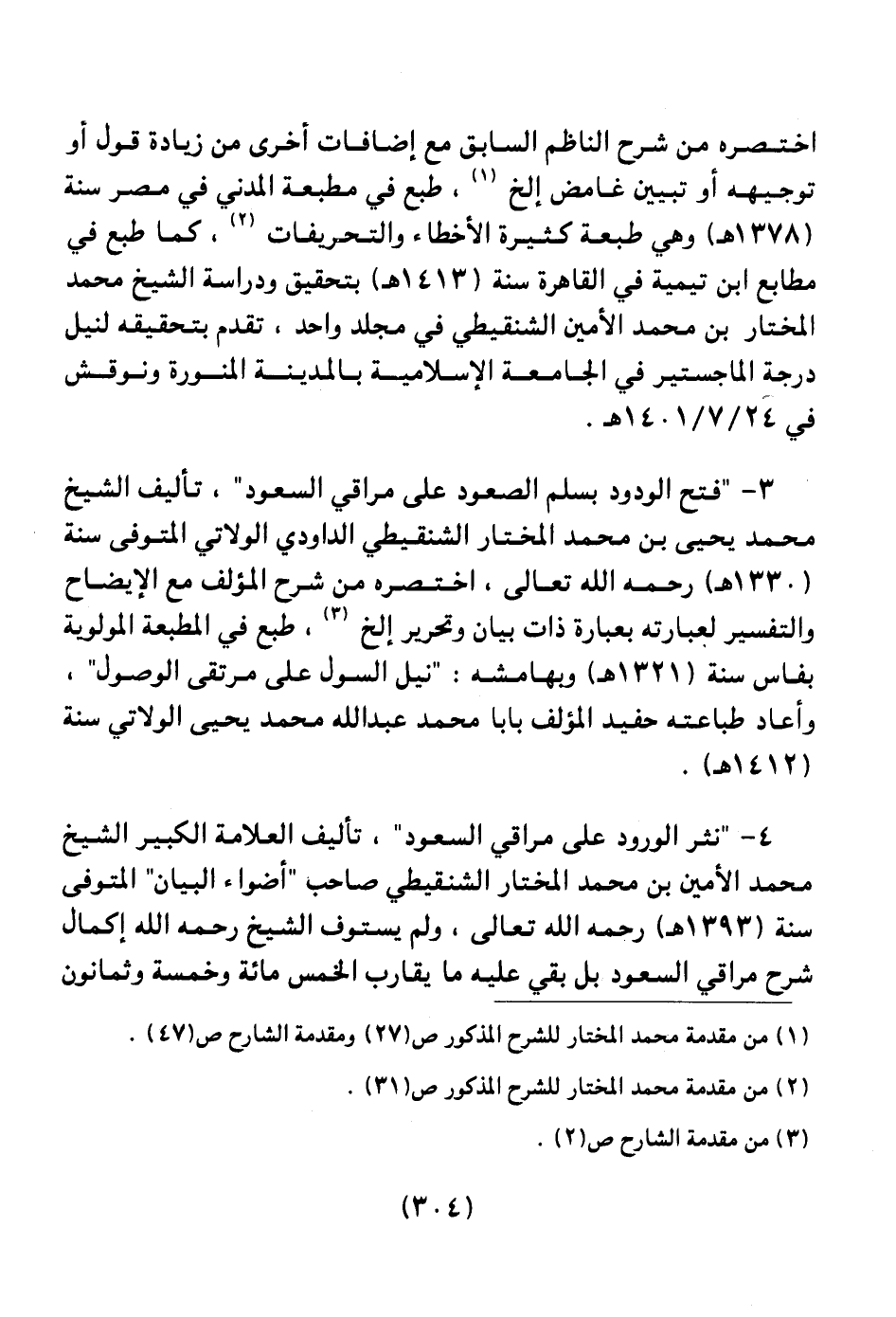 3 ـ " فتح الودود بسلم الصعود على مراقي السعود "، تأليف الشيخ محمد يحيى بن محمد المختار الشنقيطي الداودي الولاتي المتوفي سنة (1330هـ) رحمه الله تعالى، اختصره من شرح المؤلف مع الإيضاح والتفسير لعباراته بعبارة ذات بيان وتحرير إلخ (¬3) ، طبع في المطبعة المولوية بفاس سنة (1321هـ) وبهامشه: " نيل السول على مرتقى الوصول "، وأعاد طباعته حفيد المؤلف بابا محمد عبد الله محمد يحيى الولاتي سنة (1412هـ) .