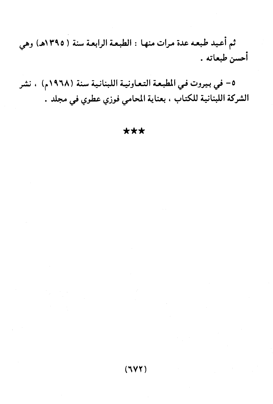 5 ـ في بيروت في المطبعة التعاونية اللبنانية سنة (1968م) نشر الشركة اللبنانية للكتاب، بعناية المحامي فوزي عطوي في مجلد.