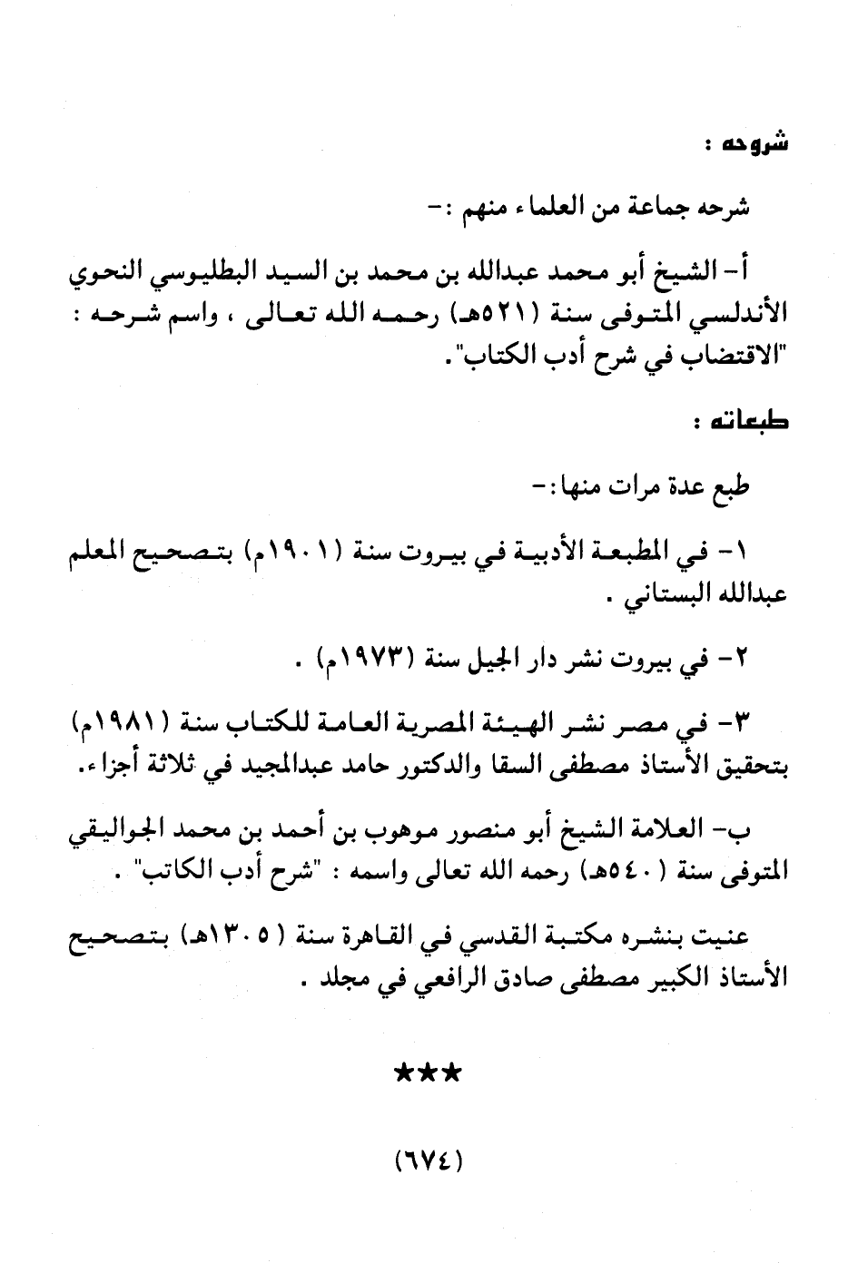 أـ الشيخ أبو محمد عبد الله بن محمد بن السيد البطليوسي النحوي الأندلسي المتوفي سنة (521هـ) رحمه الله تعالى، واسم شرحه: " الاقتضاب في شرح أدب الكتاب ".