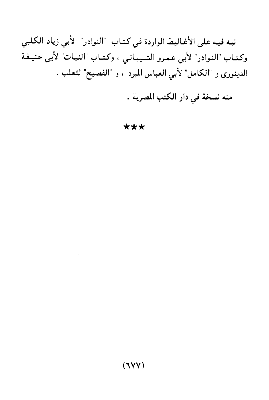 نبه فيه على الأغاليط الواردة في كتاب " النوادر " لأبي زياد الكلبي وكتاب " النوادر " لأبي عمرو الشيباني، وكتاب " النبات " لأبي حنيفة الدينوري و " الكامل " لأبي العباس المبرد، و " الفصيح" لثعلب.