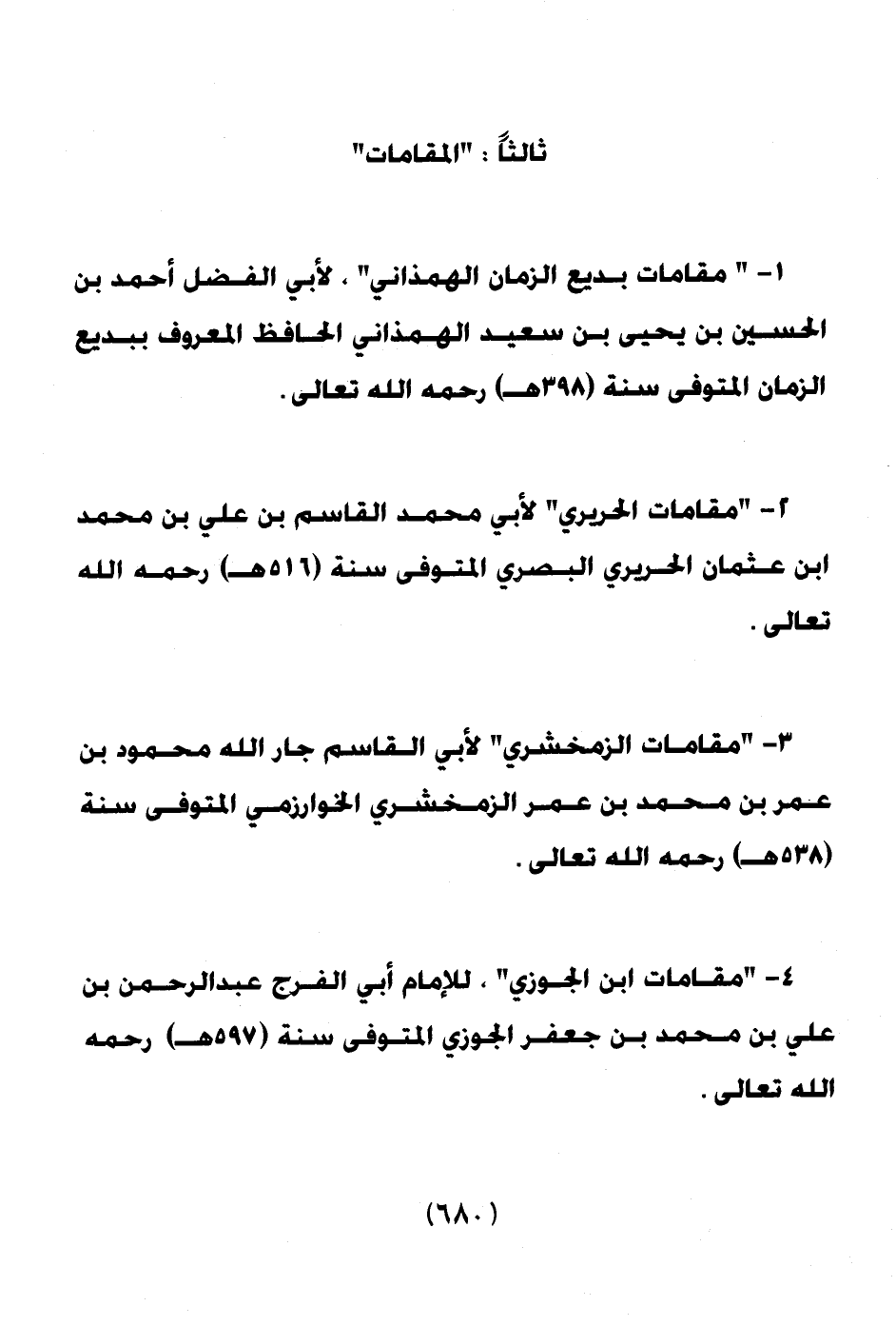 1 ـ " مقامات بديع الزمان الهمذاني " لأبي الفضل أحمد بن الحسين بن يحيى بن سعيد الهمذاني الحافظ المعروف ببديع الزمان المتوفي سنة (398هـ) رحمه الله تعالى.
