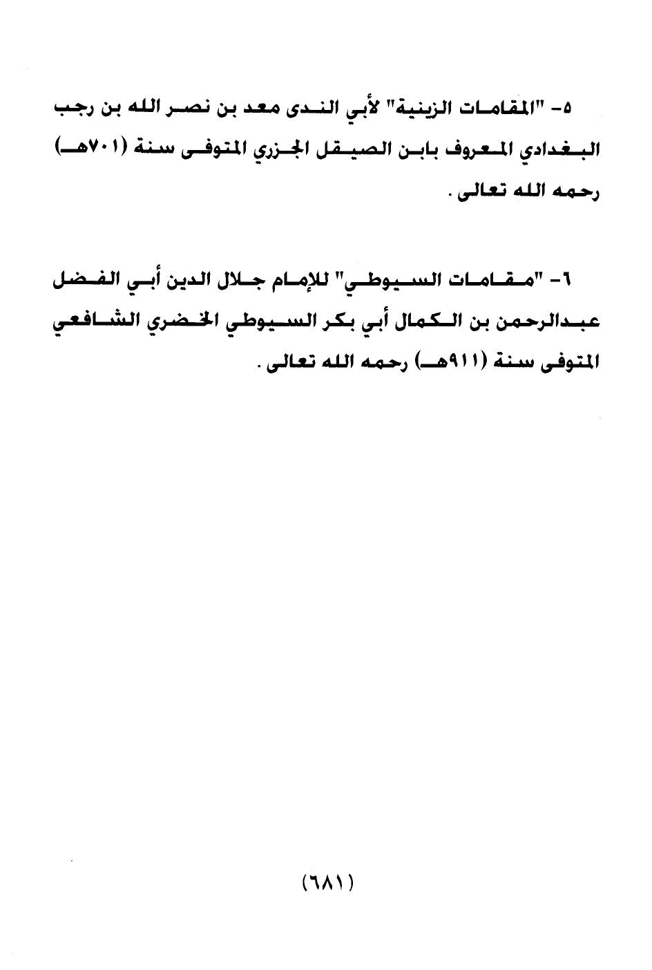 6 ـ " مقامات السيوطي " للإمام جلال الدين أبي الفضل عبد الرحمن بن الكمال أبي بكر السيوطي الخضري الشافعي المتوفي سنة (911هـ) رحمه الله تعالى.