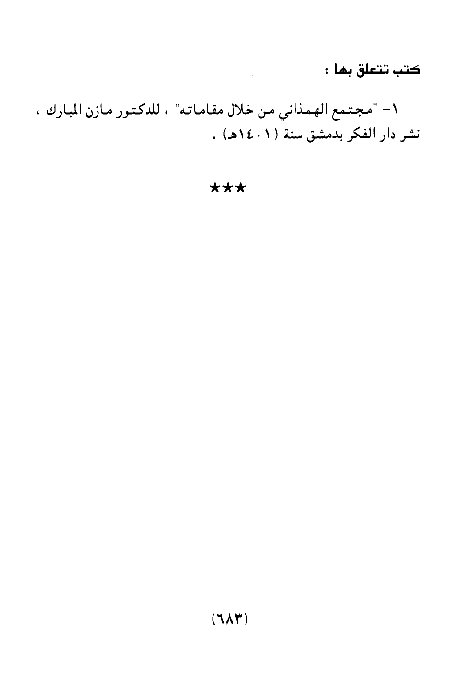 1 ـ " مجتمع الهمذاني من خلال مقاماته " للدكتور مازن المبارك، نشر دار الفكر بدمشق سنة (1401هـ) .