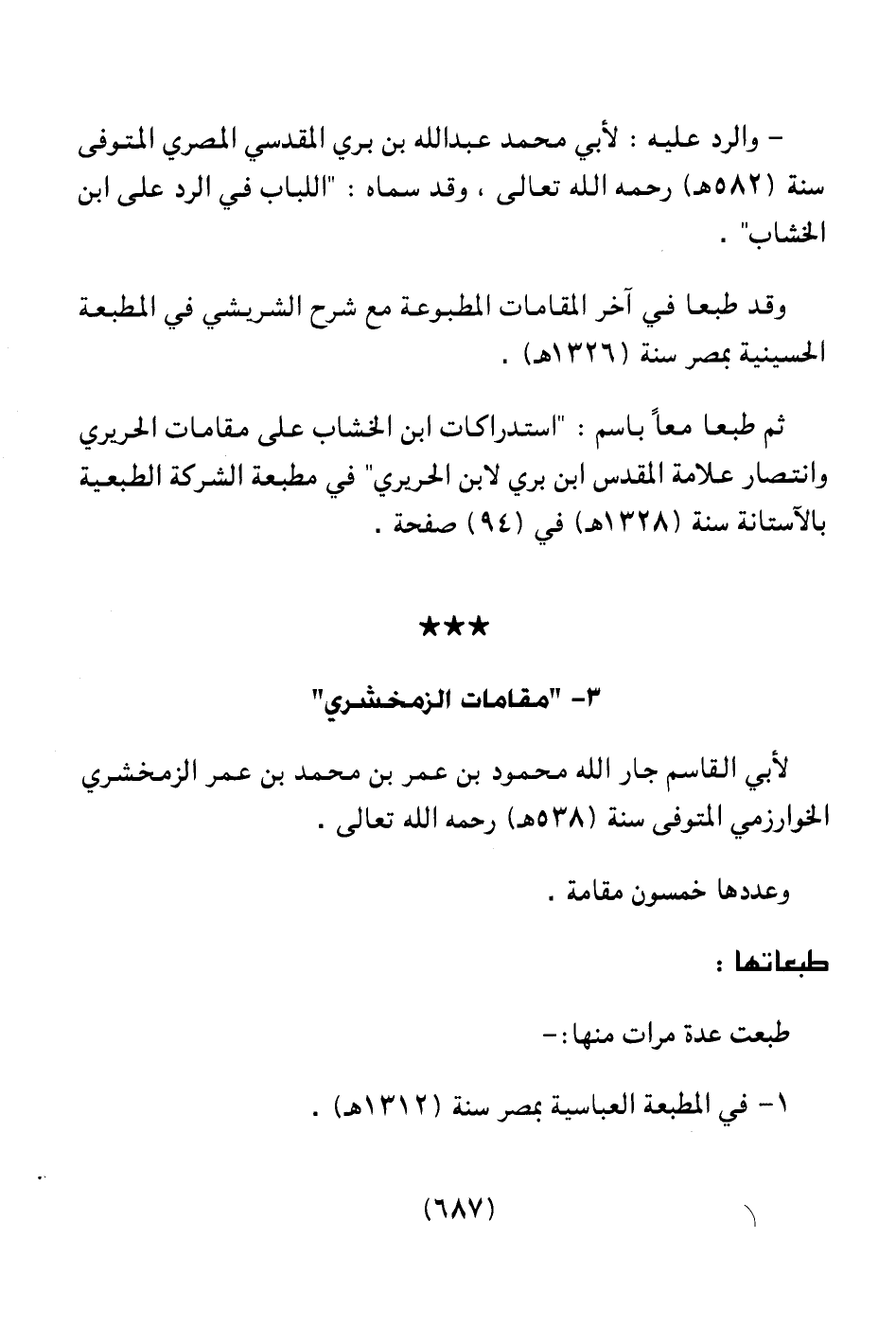 ثم طبعا معاً باسم: " استدراكات ابن الخشاب على مقامات الحريري وانتصار علامة المقدس ابن بري لابن الحريري " في مطبعة الشركة العربية بالآستانة سنة (1328هـ) في (94) صفحة.