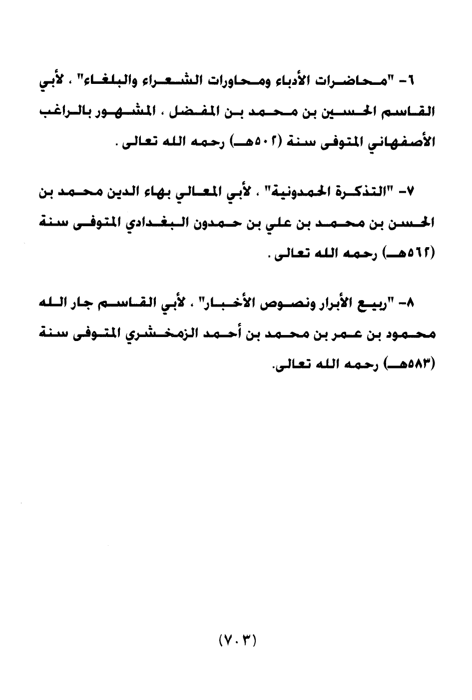 6 ـ " محاضرات الأدباء ومحاورات الشعرات والبلغاء " لأبي القاسم الحسين بن محمد بن المفضل المشهور بالراغب الأصفهاني المتوفي سنة 502هـ) رحمه الله تعالى.