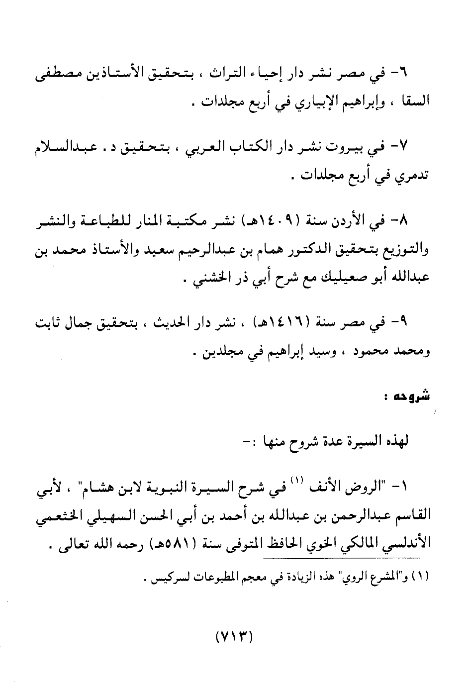 1 ـ " الروض الأنف (¬1) في شرح السيرة النبوية لابن هشام " لأبي القاسم عبد الرحمن بن عبد الله بن أحمد بن أبي الحسن السهيلي الخثعمي الأندلسي المالكي الخوي الحافظ المتوفي سنة (581هـ) رحمه الله تعالى.