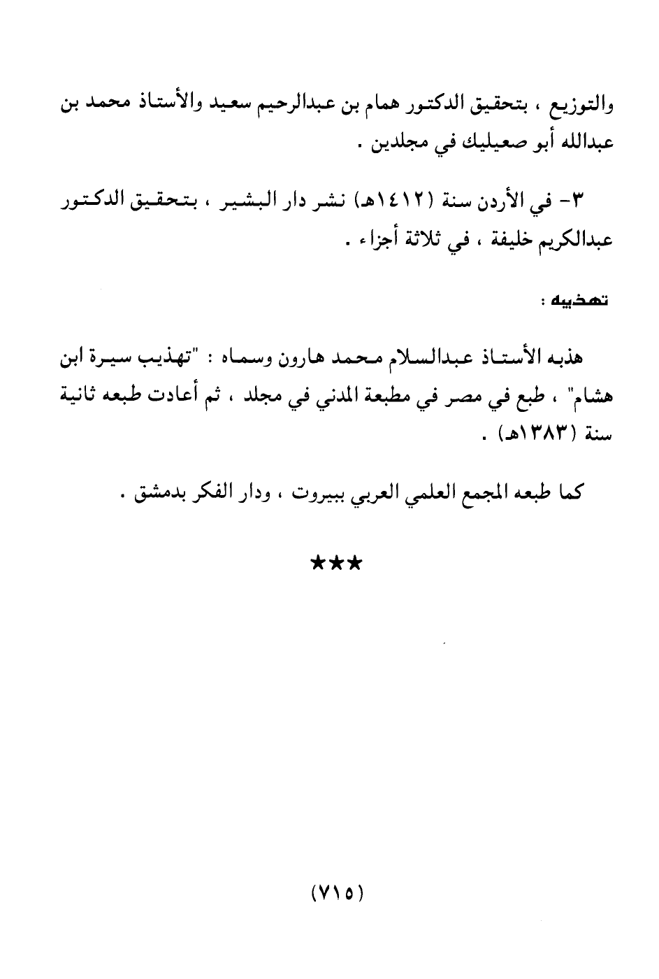 هذبه الأستاذ عبد السلام محمد هارون وسماه: " تهذيب سيرة ابن هشام " طبع في مصر في مطبعة المدني في مجلد، ثم أعادت طبعه ثانية سنة (1383هـ) .