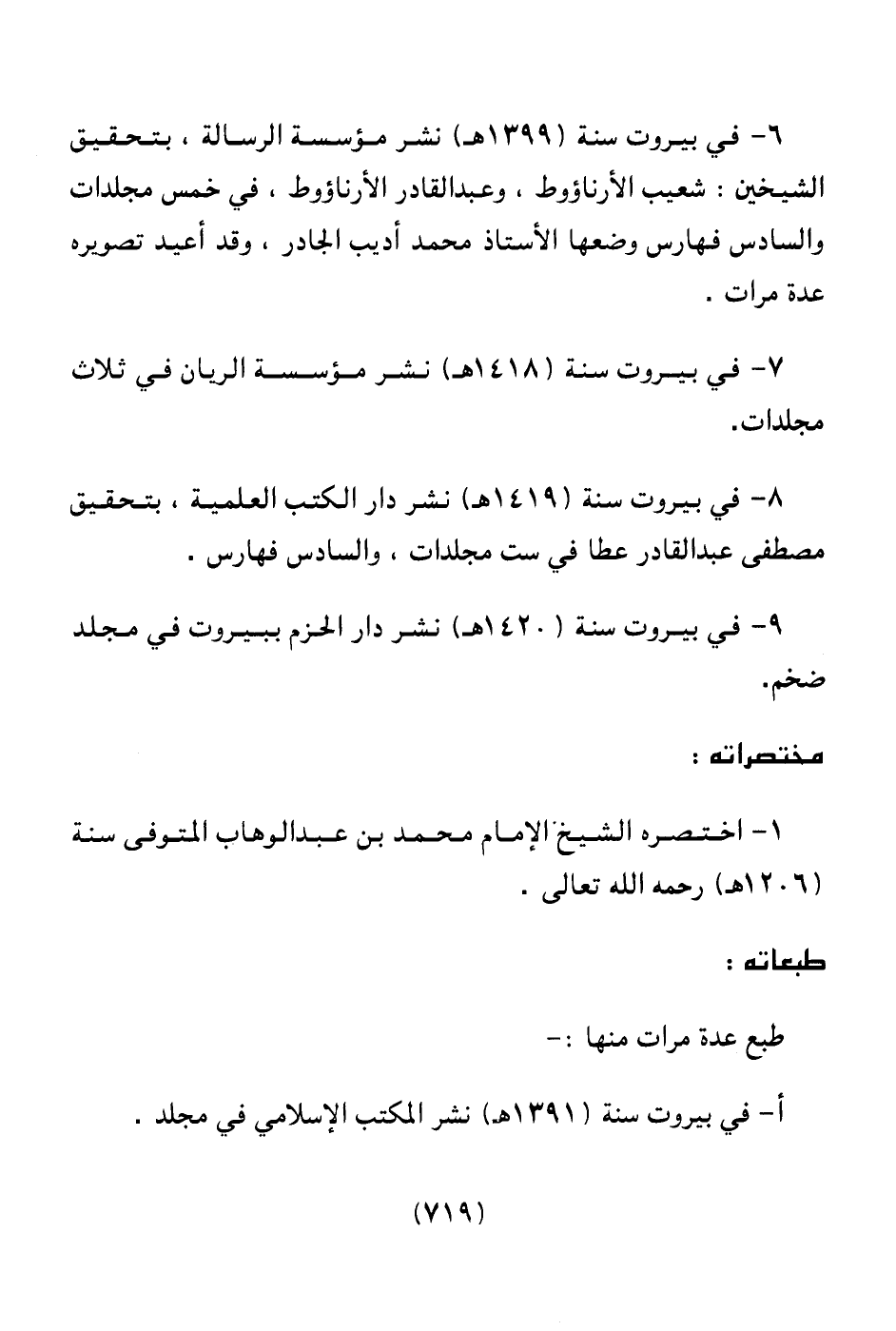 6ـ في بيروت سنة (1399هـ) نشر مؤسسة الرسالة، بتحقيق الشيخين: شعيب الأرناؤوط، وعبد القادر الأرناؤوط، في خمس مجلدات والسادس فهارس وضعها الأستاذ محمد أديب الجادر، وقد أعيد تصويره عدة مرات.