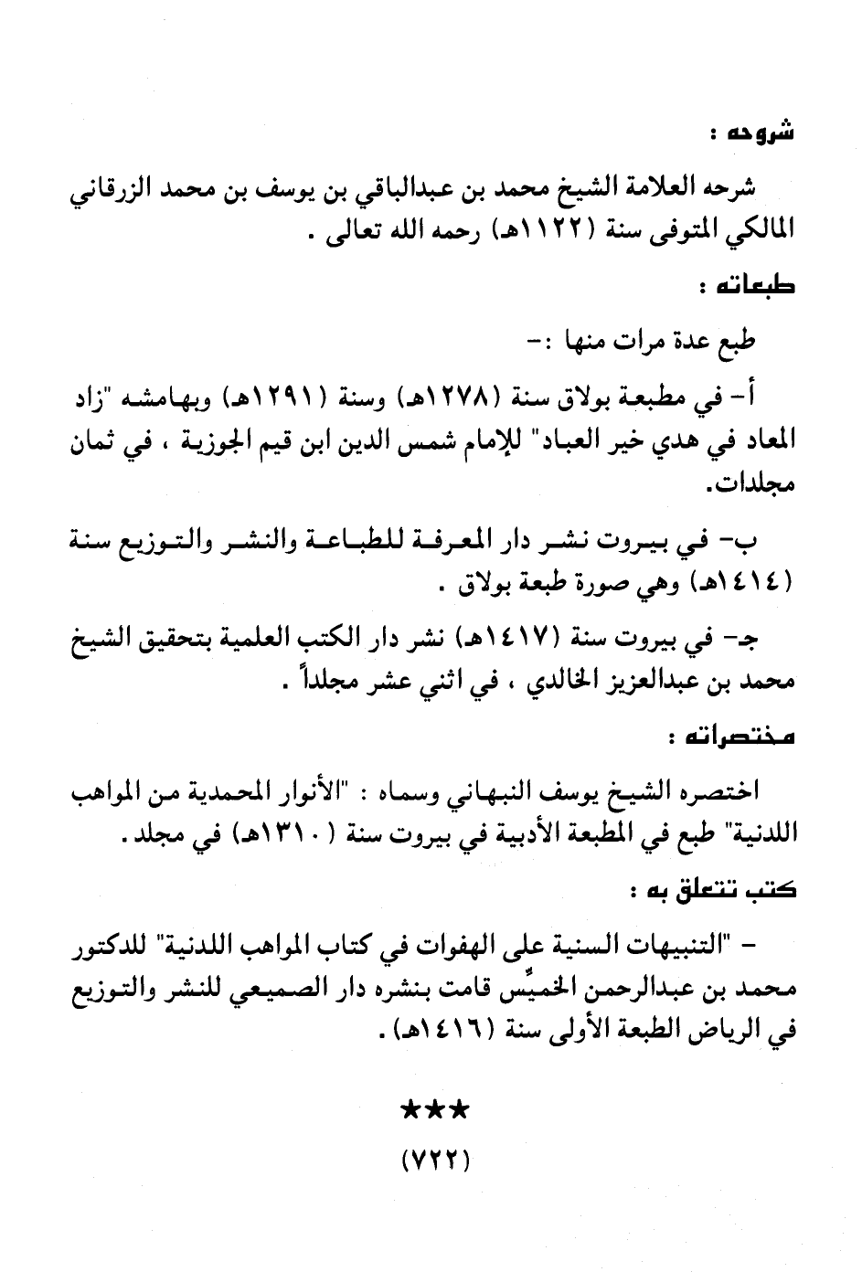 أـ في مطبعة بولاق سنة (1278هـ) وسنة (1291هـ) وبهامشه " زاد المعاد في هدي خير العباد " للإمام شمس الدين ابن قيم الجوزية، في ثمان مجلدات.