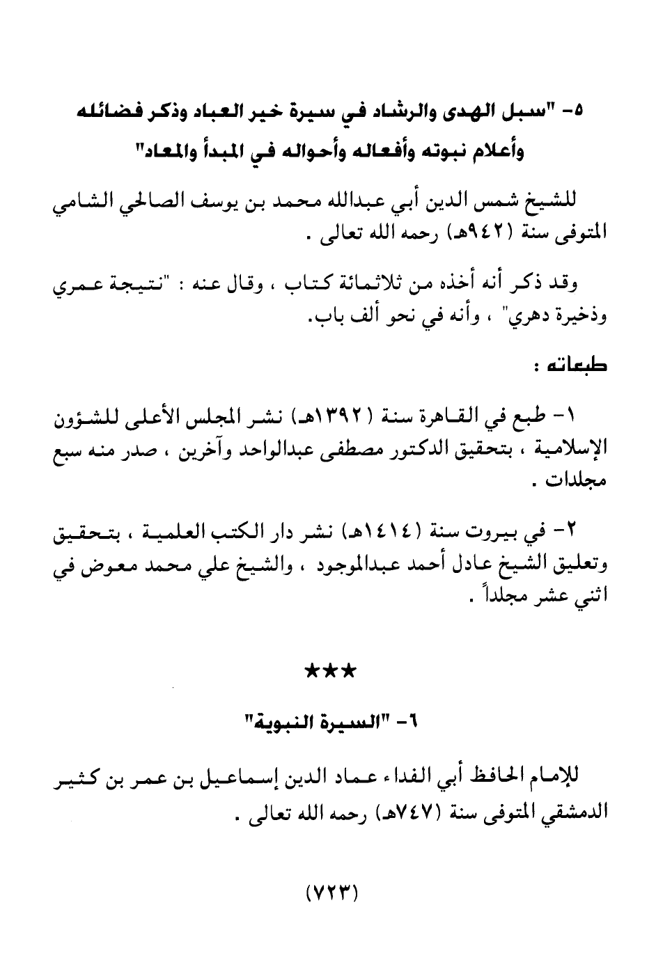 5 ـ " سبل الهدى والرشاد في سيرة خير العباد وذكر فضائله وأعلام نبوته وأفعاله وأحواله في المبدأ والمعاد ".