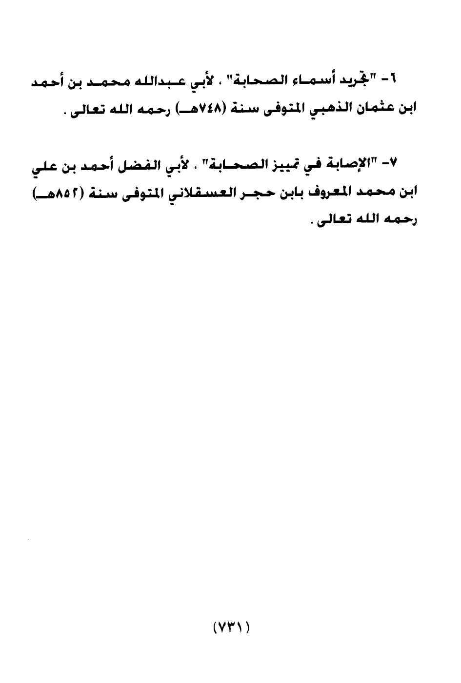 7 ـ " الإصابة في تمييز الصحابة " لأبي الفضل أحمد بن علي بن محمد المعروف بابن حجر العسقلاني المتوفي سنة (852هـ) رحمه الله تعالى.