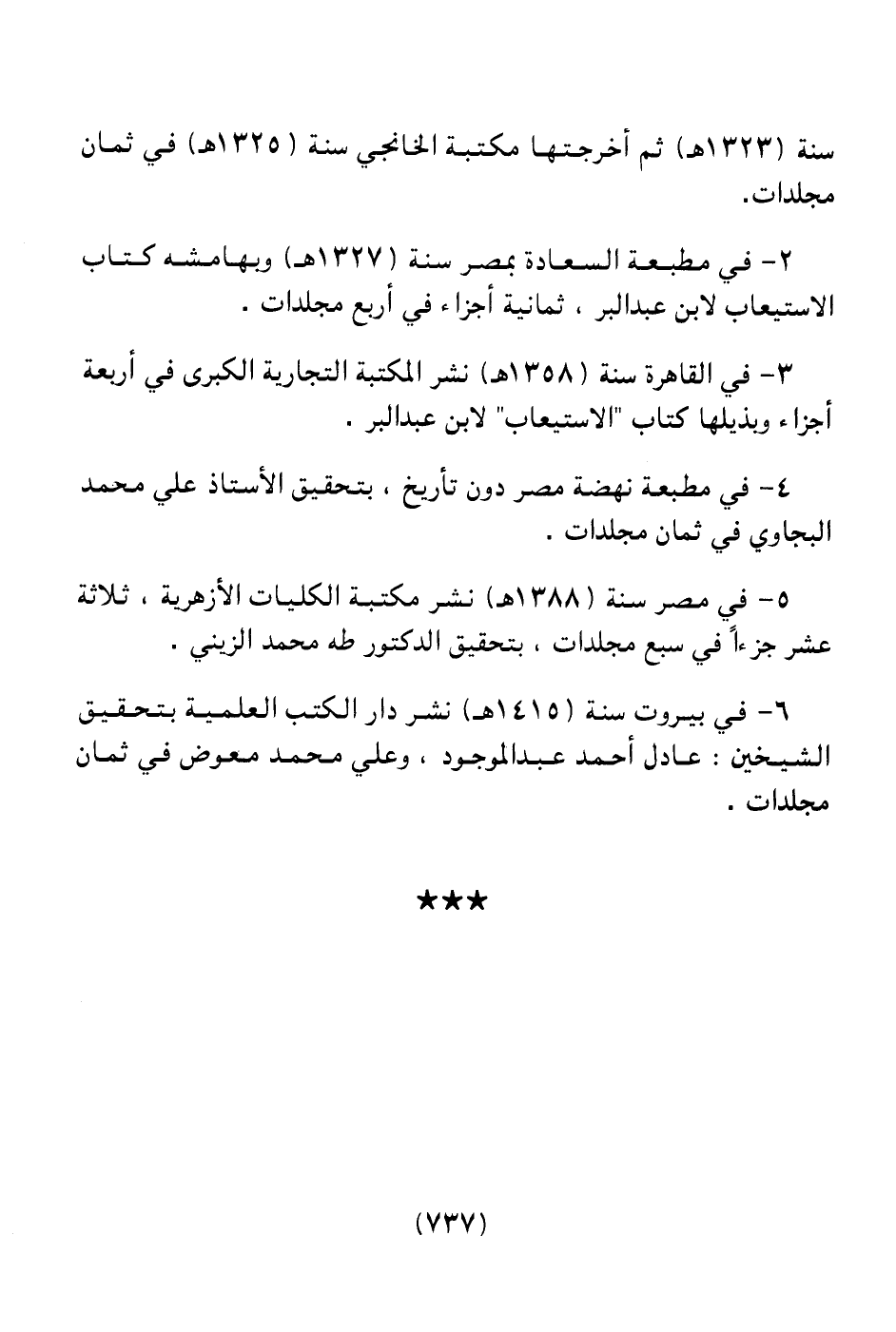 3 ـ في القاهرة سنة (1358هـ) نشر المكتبة التجارية الكبرى في أربعة أجزاء وبذيلها كتاب " الاستيعاب " لابن عبد البر.