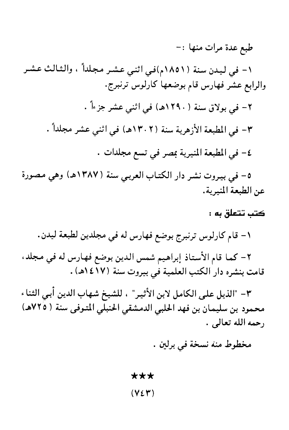 1 ـ قام كارلوس ترنبرج بوضع فهارس له في مجلدين لطبعة ليدن.