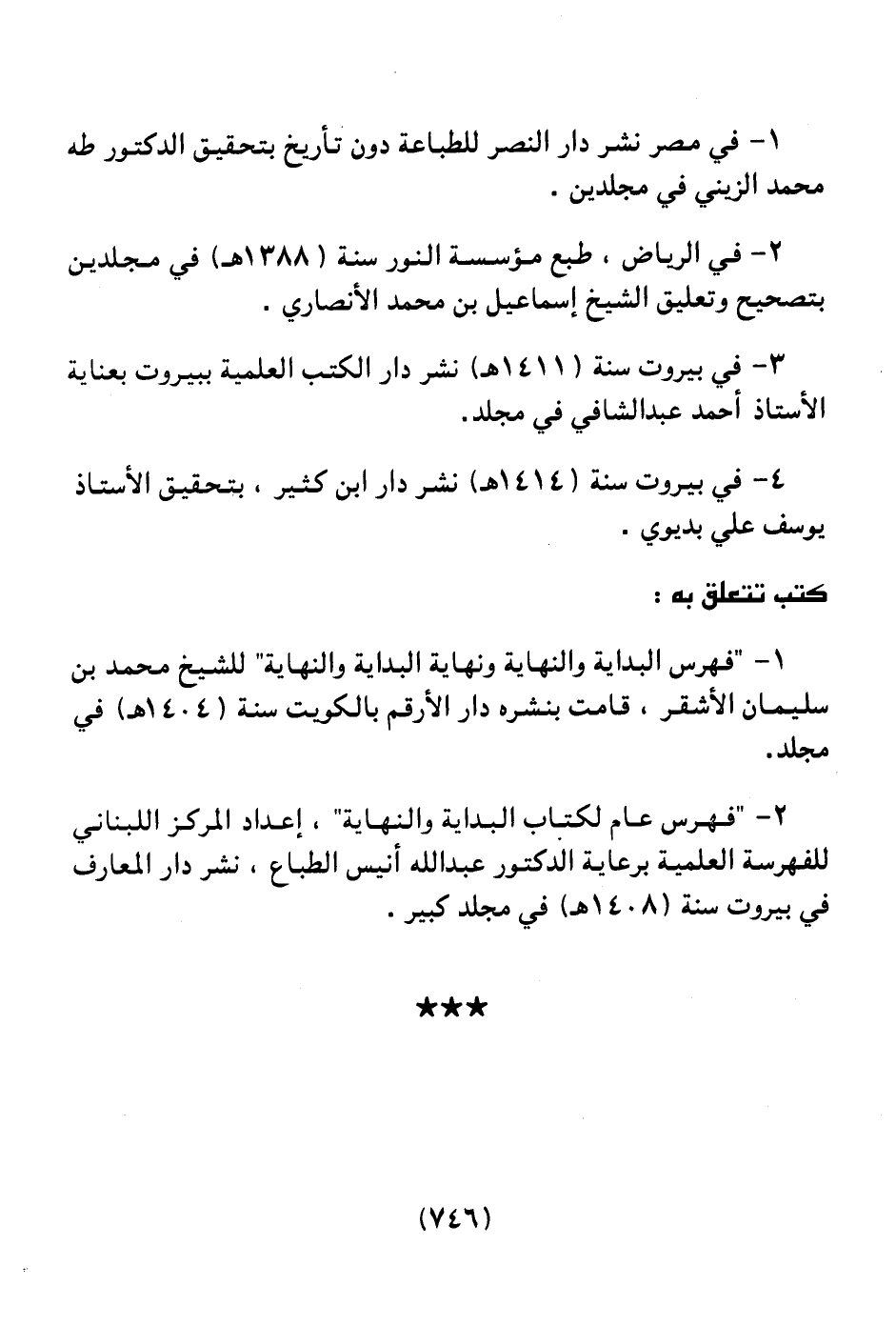 2 ـ " فهرس عام لكتاب البداية والنهاية " إعداد المركز اللبناني للفهرسة العلمية برعاية الدكتور عبد الله أنيس الطباع، نشر دار المعارف في بيروت سنة (1408هـ) في مجلد كبير.
