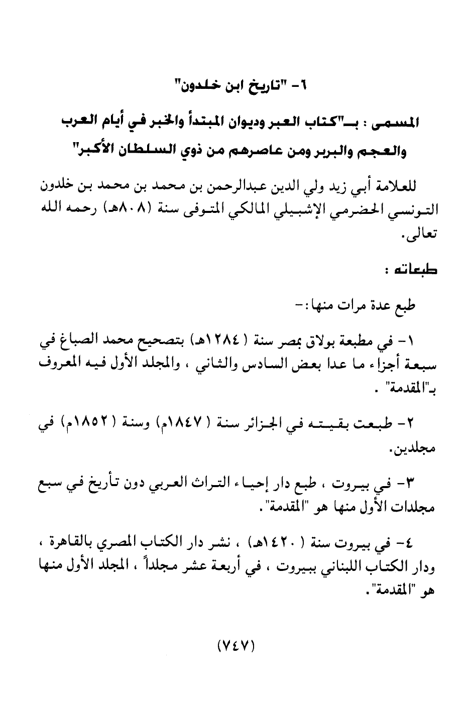 3 ـ في بيروت، طبع دار إحياء التراث العربي دون تاريخ في سبع مجلدات الأول منها هو " المقدمة ".