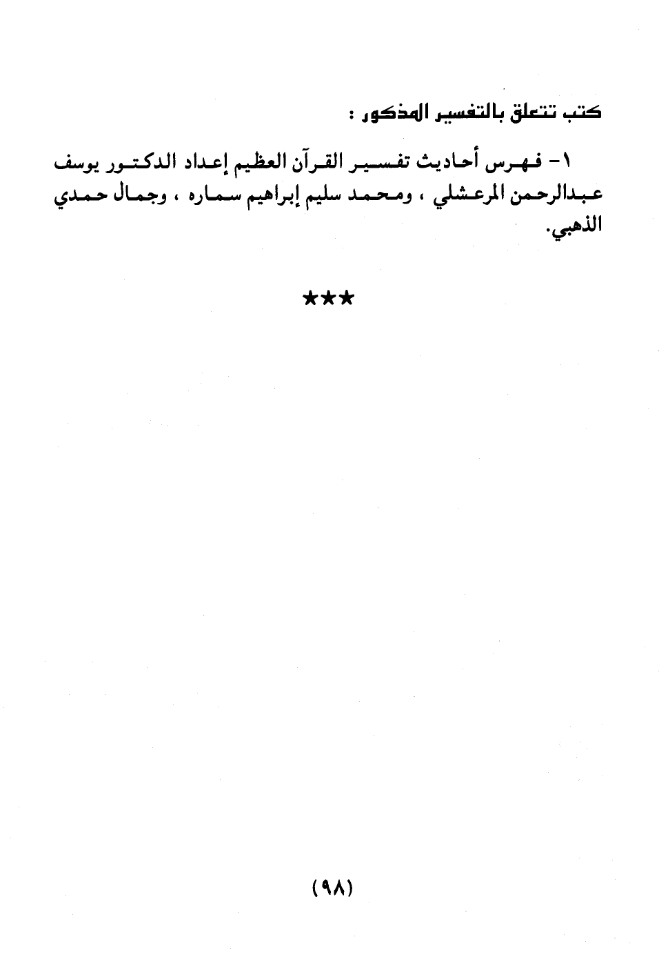 1ـ فهرس أحاديث تفسير القرآن العظيم إعداد الدكتور يوسف عبد الرحمن المرعشلي، ومحمد سليم إبراهيم سماره، وجمال حمدي الذهبي.