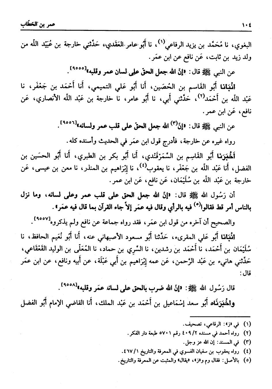 [9555] أنبأنا أبو القاسم بن الحصين أنا أبو علي التميمي أنا أحمد بن جعفر نا عبد الله بن أحمد (2) حدثني أبي نا أبو عامر نا خارجة بن عبد الله الأنصاري عن نافع عن ابن عمر عن النبي (صلى الله عليه وسلم) قال إن الله جعل الحق على قلب عمر ولسانه