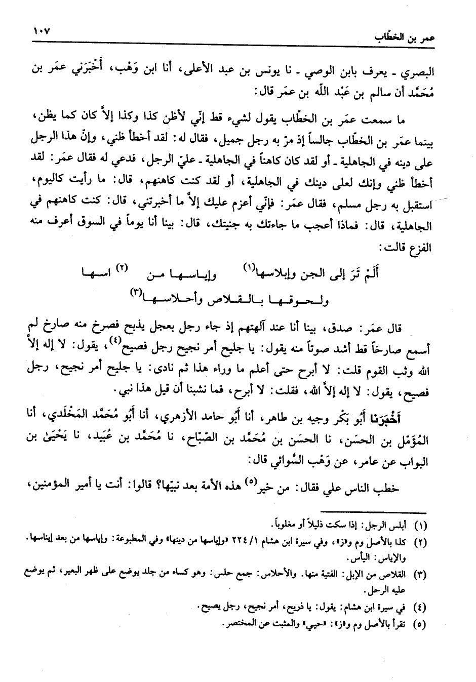 البصري يعرف بابن الوصي نا يونس بن عبد الأعلى أنا ابن وهب أخبرني عمر بن محمد أن سالم بن عبد الله بن عمر قال ما سمعت عمر بن الخطاب يقول لشئ قط إني لأظن كذا وكذا إلا كان كما يظن بينما عمر بن الخطاب جالسا إذ مر به رجل جميل فقال له لقد أخطا ظني وإن هذا الرجل على دينه في الجاهلية أو لقد كان كاهنا في الجاهلية علي الرجل فدعي له فقال عمر لقد أخطأ ظني وإنك لعلى دينك في الجاهلية أو لقد كنت كاهنهم قال ما رأيت كاليوم استقبل به رجل مسلم فقال عمر فإني أعزم عليك إلا ما أخبرتني قال كنت كاهنهم في الجاهلية قال فماذا أعجب ما جائتك به جنيتك قال بينا أنا يوما في السوق أعرف منه الفزع قالت: ألم تر إلى الجن وإبلاسها * (1) وإياسها من (2) اسها ولحوقها بالقلاص وأحلاسها (3) قال عمر صدق بينا أنا عد آلهتهم إذ جاء رجل بعجل يذبح فصرخ منه صارخ لم أسمع صارخا قط أشد صوتا منه يقول يا جليح أمر نجيح رجل فصيح (4) يقول لا إله إلا الله وثب القوم قلت لا أبرح حتى أعلم ما وراء هذا ثم نادى يا جليح أمر نجيح رجل فصيح يقول لا إله إلا الله فقلت لا أبرح فما نشبنا أن قيل هذا نبي أخبرنا أبو بكر وجيه بن طاهر أنا أبو حامد الأزهري أنا أبو محمد المخلدي أنا المؤمل بن الحسن نا الحسن بن محمد بن الصباح نا محمد بن عبيد نا يحيى بن البواب عن عامر عن وهب السوائي قال خطب الناس علي فقال من خير (5) هذه الأمة بعد نبيها قالوا أنت يا أمير المؤمنين